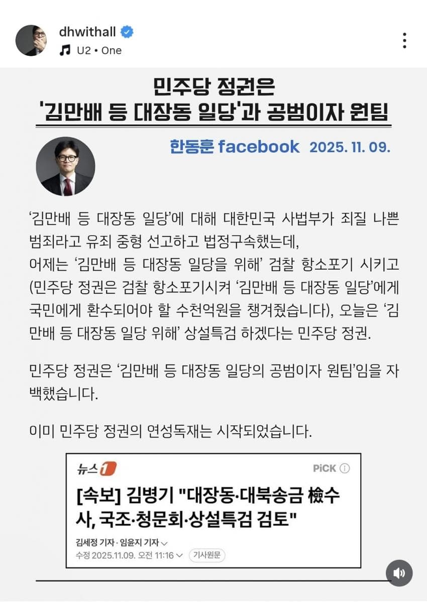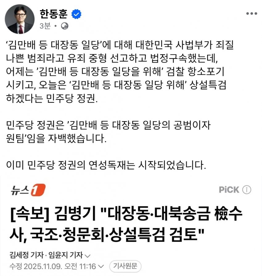 뚜껑이가 지금 발작이유 대장동 사건 조작질에 주범이거든 근데 민주당이 특검 국정감사 법사위 긴급 질의 다 받겠다 응 안넘어가 관려자 다 찾아서 보복 색출할거야 나오니깐 발작말곤 할게 없음 특히 응 우리 기소청 가면됨 하는 검사들에게 재대로 말해줬지 응 심사해서 뽑는거야 기존검사들 100프로 가는거 아니야라고 정치검사들 이제 진짜 아예 입지가 없음