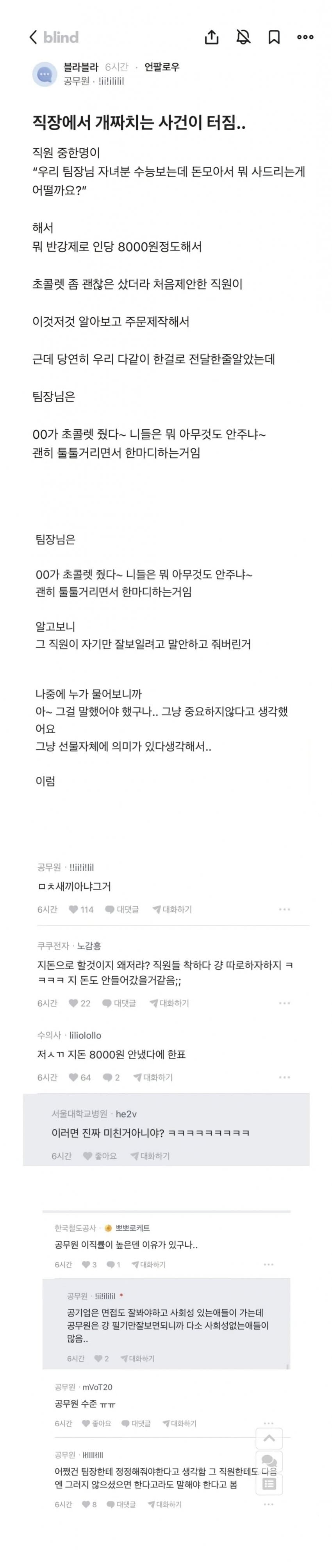 과장도 아니고 팀장한테 저런 선물 주면서 사바사바한다고? 개주작임