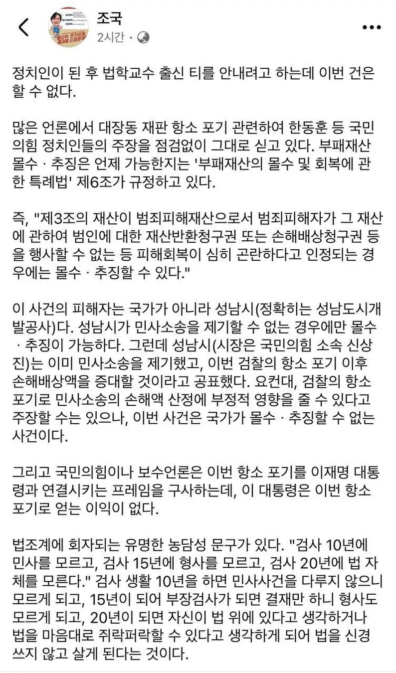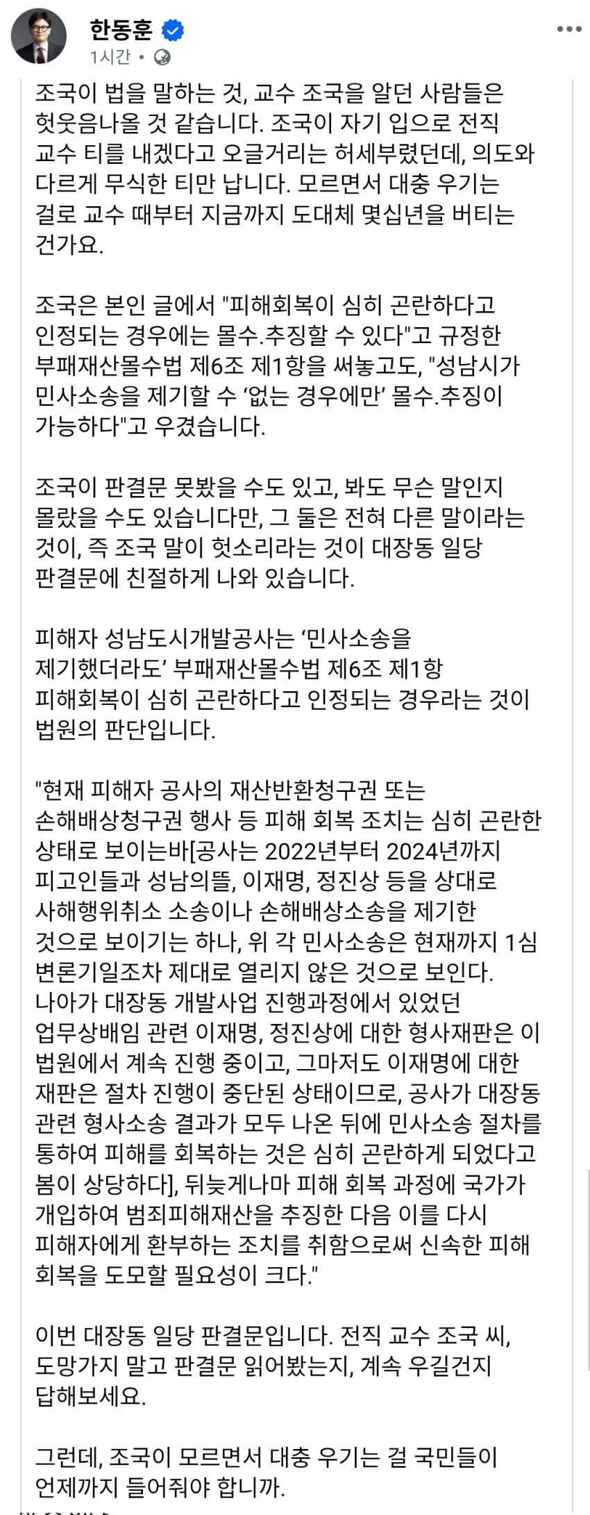 저게 웃긴게 판결문에 직접 국가에서 환수하라고 나와 있다고 함. 근데 조국 저인간은 그것도 모르고 국가에서 환수 못한다 어쩌구 그럼. 아니 법원에서 법을 따져서 국가에서 환수하라고 판결 내렸는데. 결국 저 조국은 판결문 볼줄도 모르고 제대로 읽어 봤을런지도 의문임. 적어도 한동훈은 판결문 한번이라도 훑어본거 같음