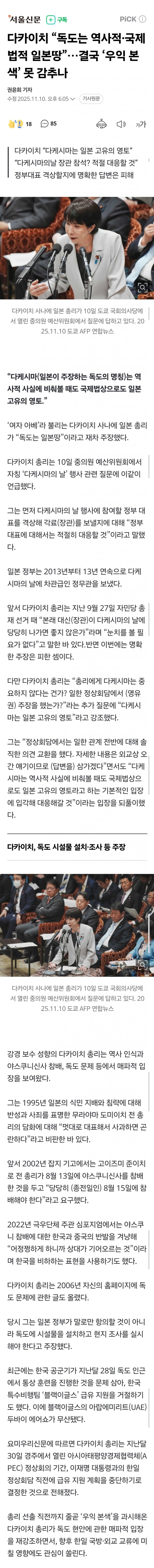 다카이치: 센카쿠(시나징 명칭 댜오위댜오)는 일본영토모든 중국인은 잠재적 간첩대만은 독립국가, 집단자위권으로 대만방위에 참여할수 있다야스쿠니 신사에 중국과 한국이 쓸데 없이 참견한다다케시마는 일본영토그저 맞는말만 하시는 다카이치상