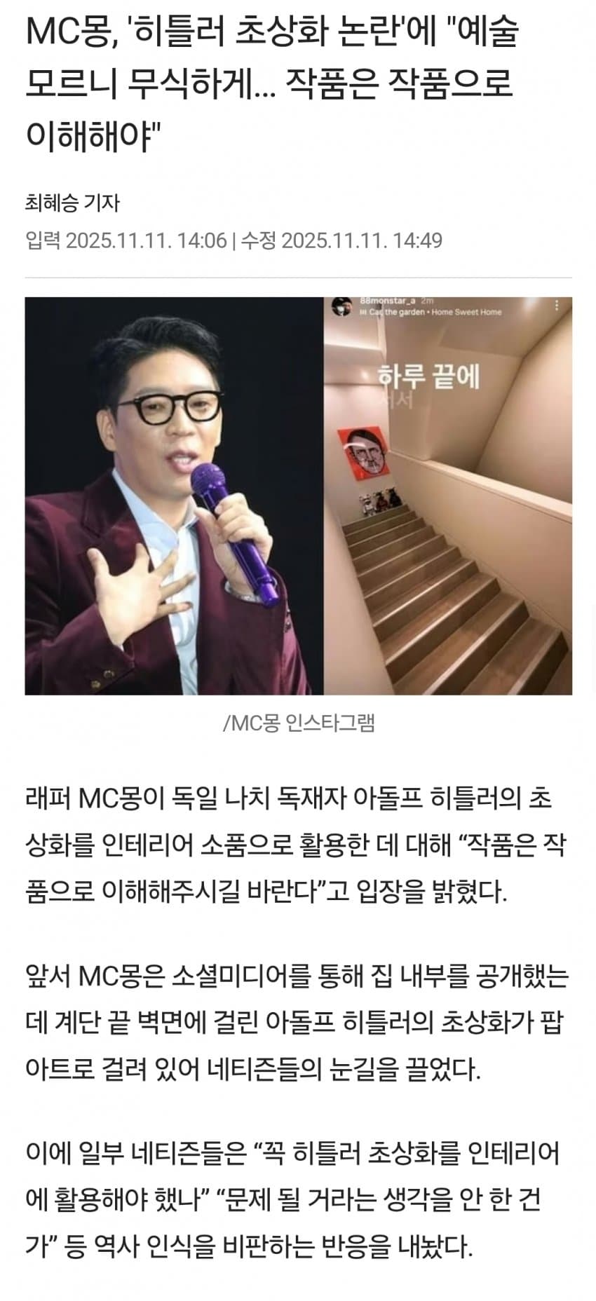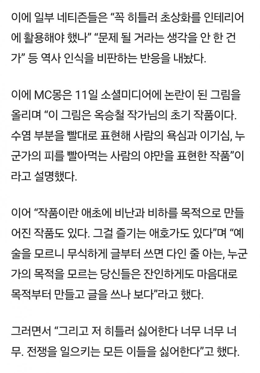 MC몽은 예술 작품은 대상을 비난과 비하 목적으로 만들어진 작품도 있다 자기는 히틀러 너무 싫어한다고 해명함