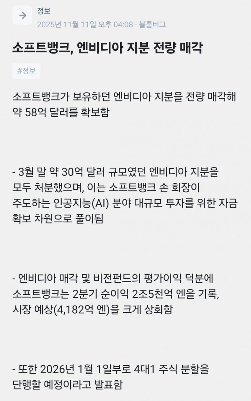 소프트뱅크에서 엔비디아 전액 팔 정도면은무슨 정보를 미리 입수를 했다는 거지