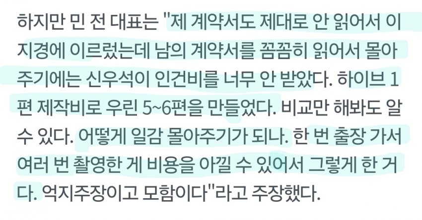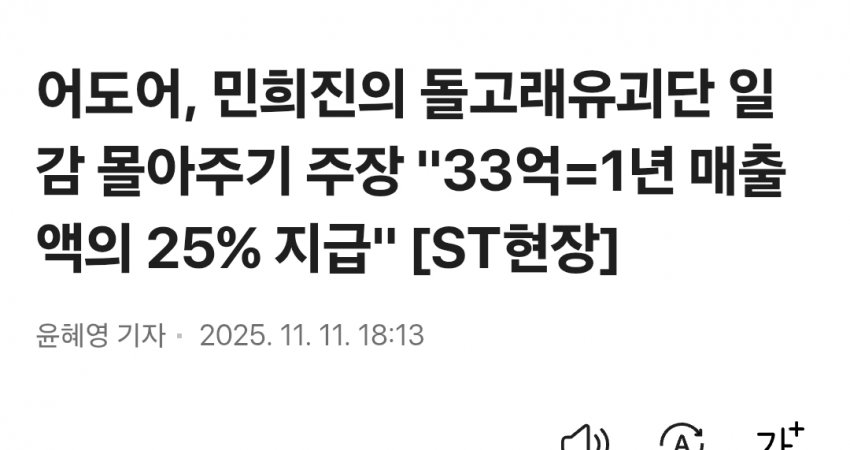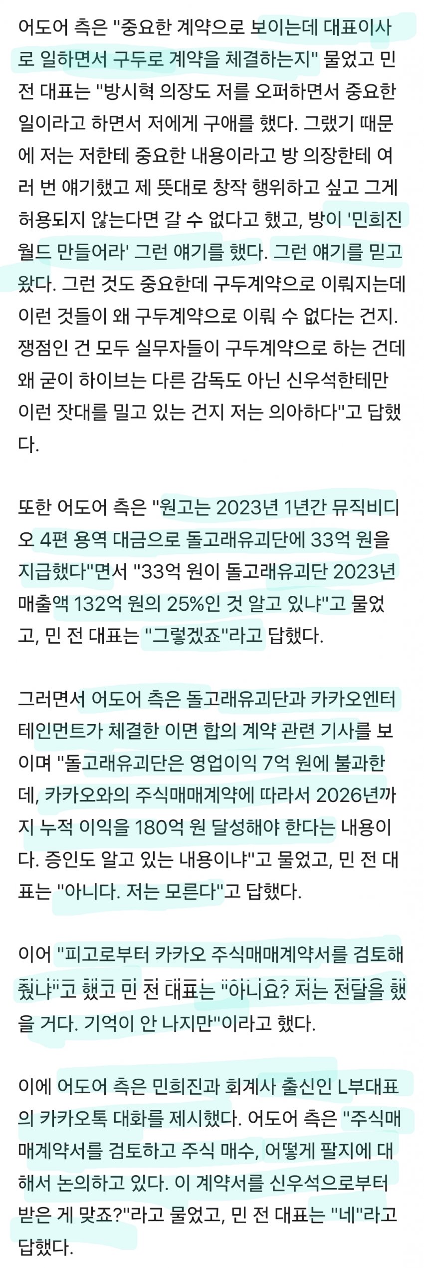 말인지 방구인지;;;...억단위가 누구집 개이름이냐 ㅋ 것도 하입 같은 대기업 엔터가 모든 걸 구두로?... 멀쩡히 소속사 어도어가 있는데 오직 돌고래는 민과 이러쿵저러쿵 음냐 ^^쿵짝질로 구두로 했다는 거야뭐야?그리고 저 민줌 말로는 방이 지한테 민희진월드를 만들어라?.. 어쩌구햇다는 게 민줌한테 디렉팅 전반을 맡겼다는 내용으로 이해될 지언정,