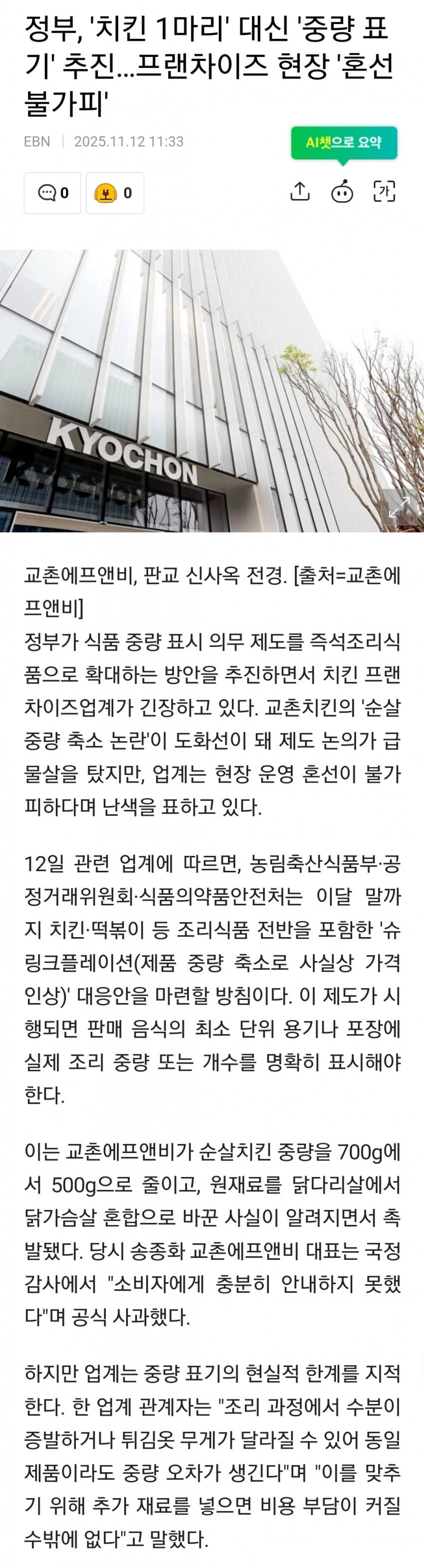 량 표기는 추가로 해야되는거지. 1마리 대신이 되어버리면 장난질 무조건 치지. 튀김 무게부터 시작해서 떡 집어넣고 소스 잔뜩 집어넣으면 어떻게 구분할거임? 지금도 치킨집 정직하게 하는 집들은 1마리 표기 외에 g 표기까지 해놓고 팔고 있어. 장난질 치는 애들을 잡아야지. 저렇게 되면 치킨이 아닌 소스 잔뜩 넣고 떡 잔뜩 넣고 그람수 맞잖아요 하면 어쩔거임? 생각을 하면서 살자 진짜.