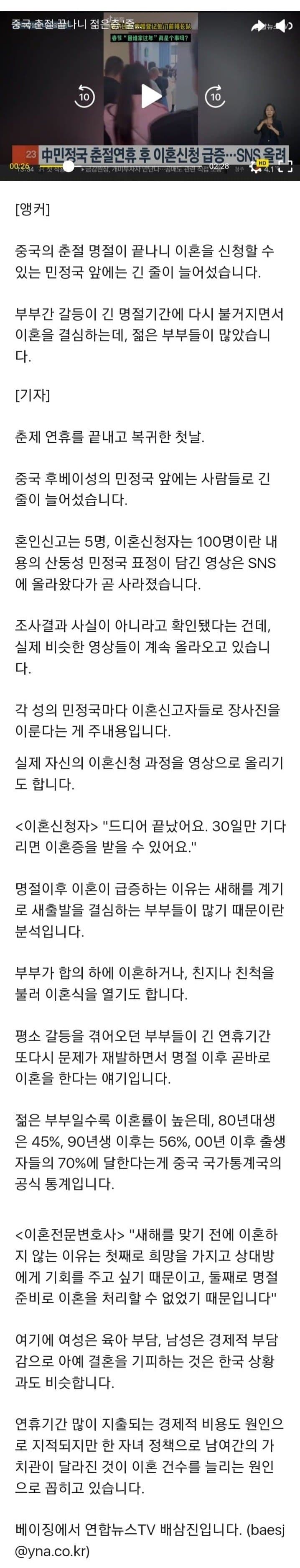 중국 80년생 45%가 이혼, 90년생 56%가 이혼, 00년생 70%가 이혼