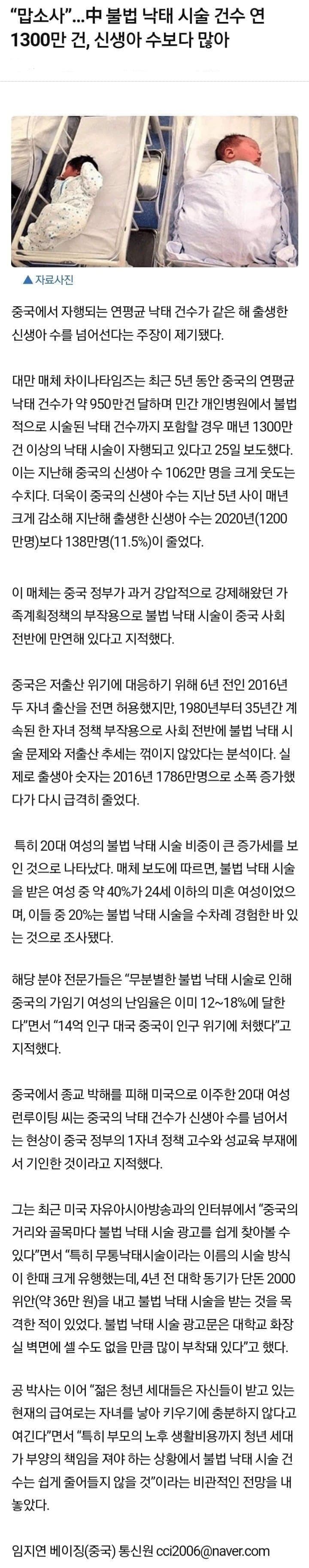 중국 출생아 숫자는 800만명대인데 중국여자의 연간 낙태는 1300만건 (한자녀 정책은 이미 2015년에 폐지)