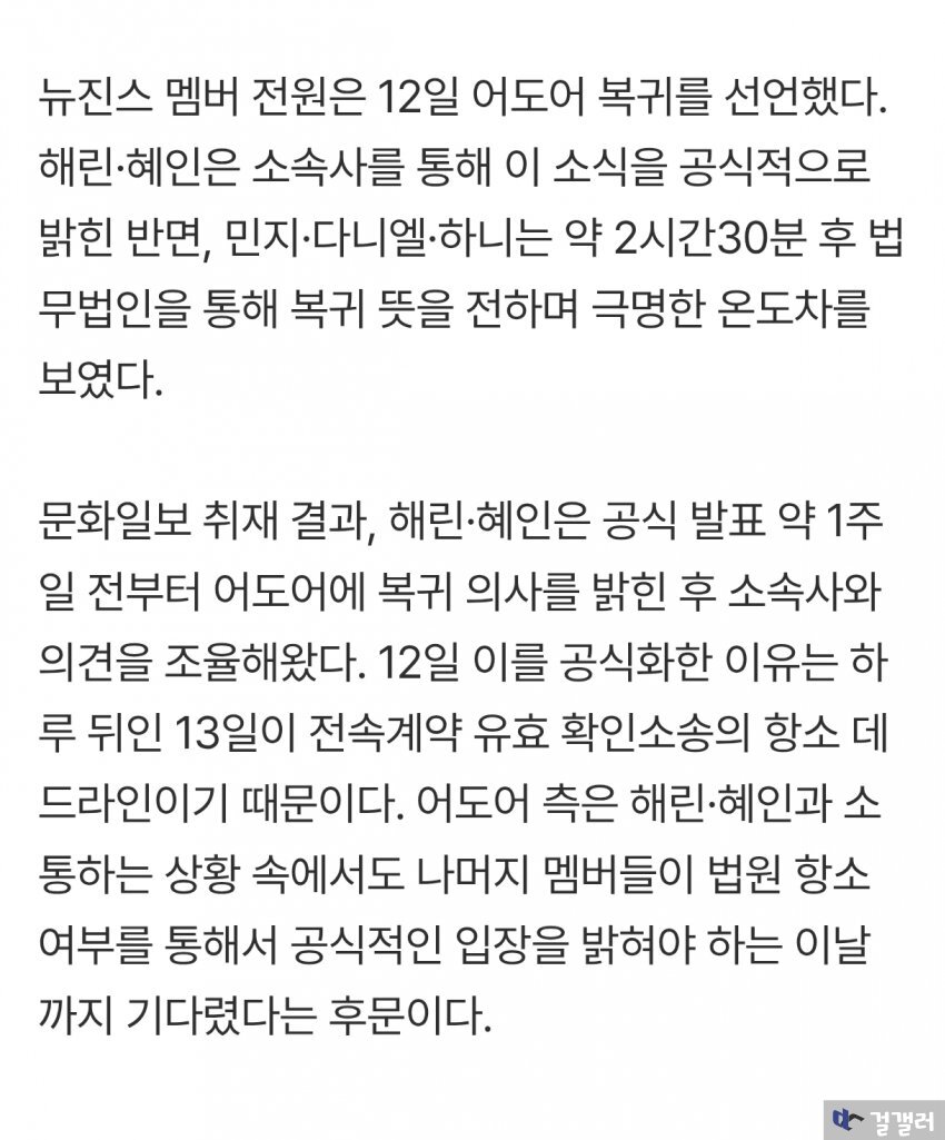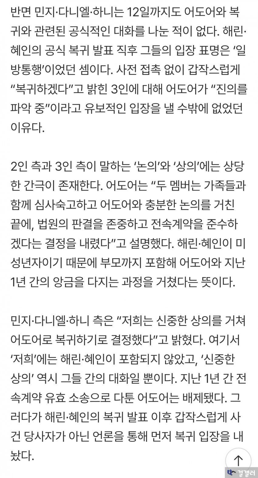 “뉴진스 2인, 1주일 전부터 복귀 논의” 3인은 일방 통보