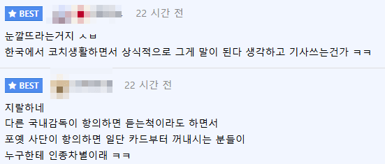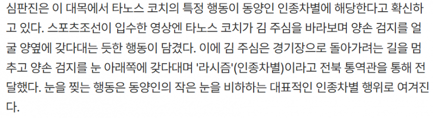 가장 핵심은 심판이 ‘인종차별’이라고 느꼈다는점행위를 당한 심판이 그렇게 느꼈다는데지들이 뭔데 아니다 오해다 이러는거냐?언제는 피해자가 기분나쁘면 범죄라면서?왜 여기서는 줏대가 다른데?