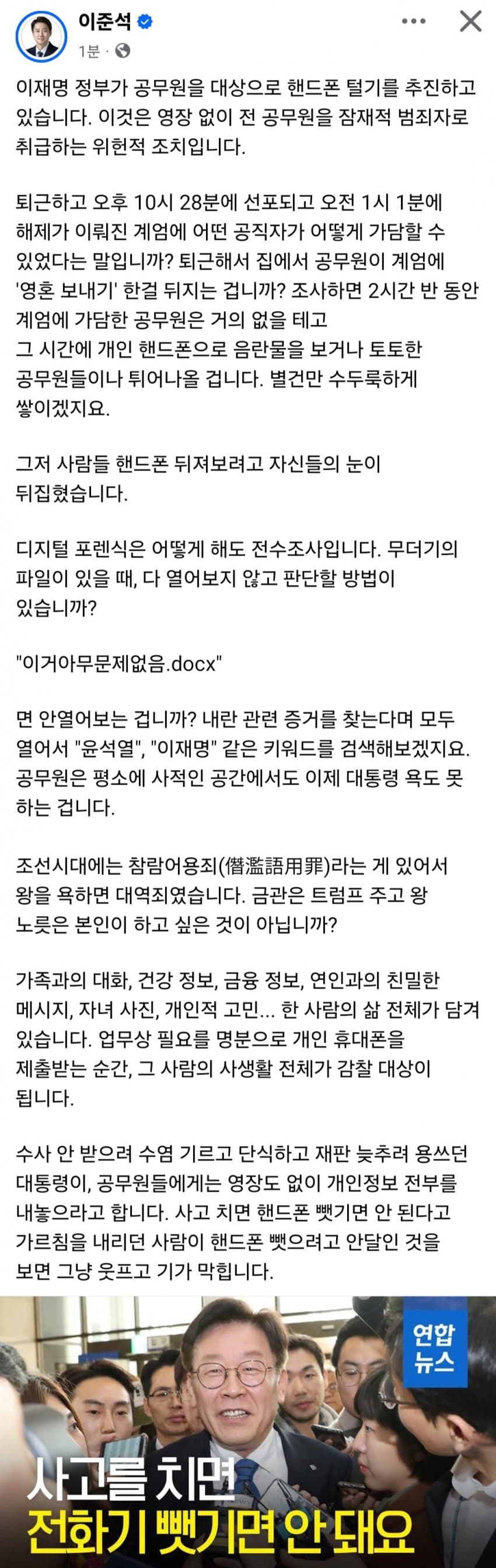 [이준석 페북] 영장 없이 75만 공무원 휴대폰을 턴다고?