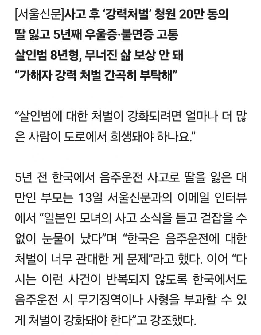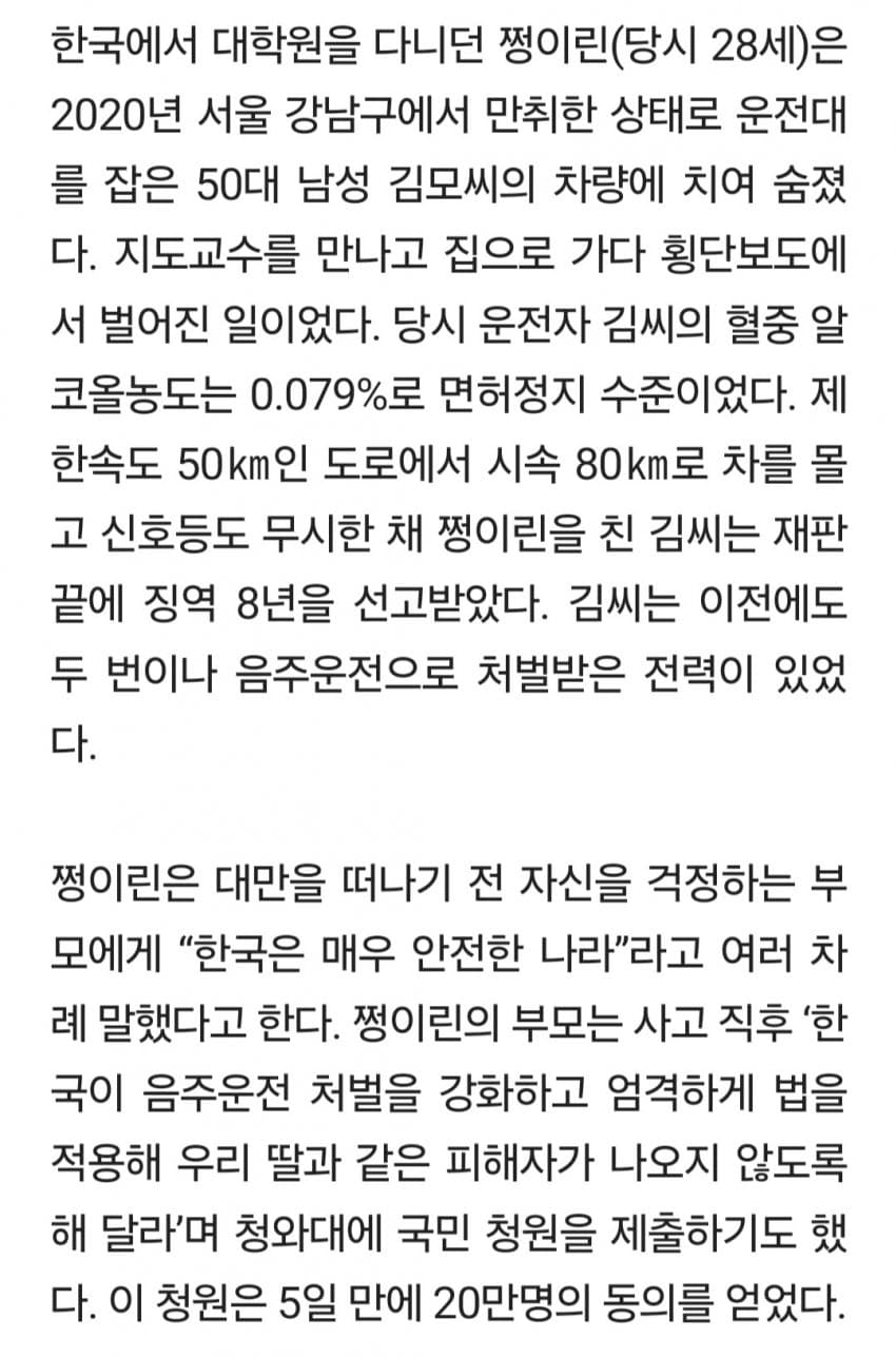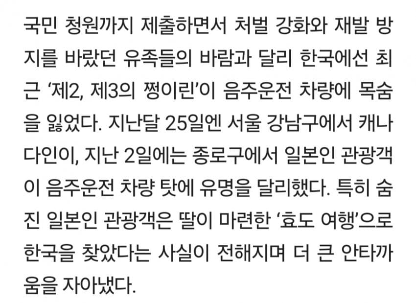 그렇게 윤창호 지인들이 난리를 쳐서 겨우겨우 윤창호법을 만들어도 윤창호법 이전과 별 다를바가 없음살인죄 적용중에 가장 형량이 적은게 바로 음주 운전이지스토킹 살인이든 우발적 살인이든 최소 10년 전후로 받는데 음주 운전은 5년 전후로 받지 높아도 10년 안짝임사람 죽이고 싶을땐 차로 뒤질라게 쳐버리고 그 자리에서 술 퍼마시면 됨 가장 합리적인 살인 방법임더 합리적인건 가난한 집 청소년 하나 몇억에 매수해서 청소년보고 차로 들이받고 술 마시라고 설계를 하면 됨그 청소년은 길어야 몇년으로 평생 벌까말까한 돈을 받는거지