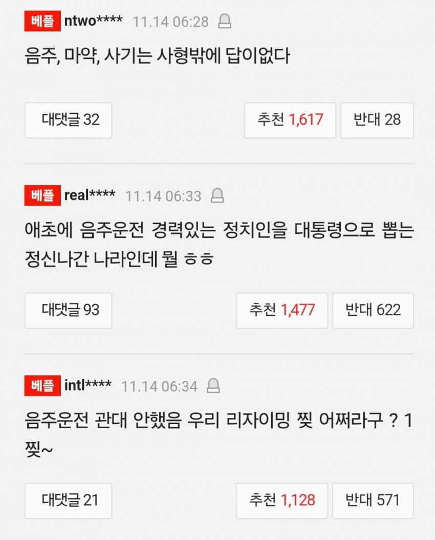 국민 절반 가까이가 음주운전 범죄자를 대통령으로 뽑았는데 말해서 뭐해~ 니들이 뽑은 대통령이야~
