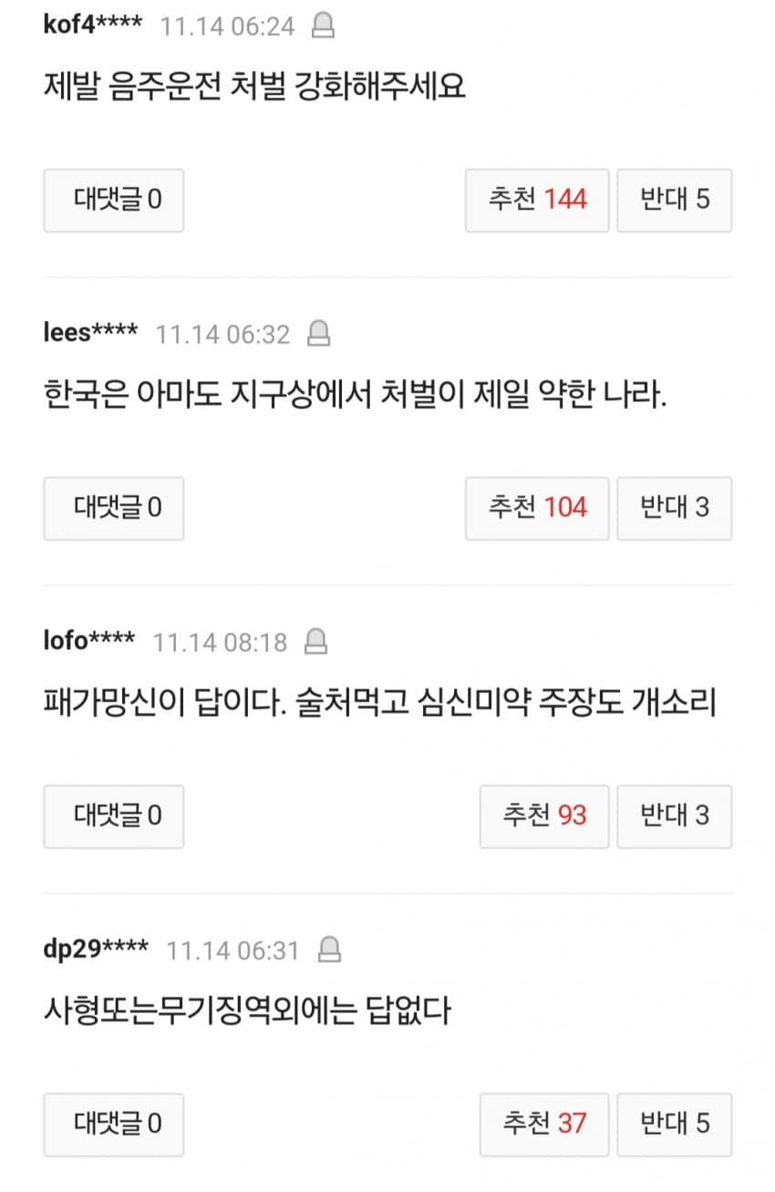 음주운전은 변호사, 판사들이 꿀빠는 이권인데 이걸 처벌을 강화하자고? 청원하는 니들이 총들고가서 법조인들 다 죽이고 법재정해