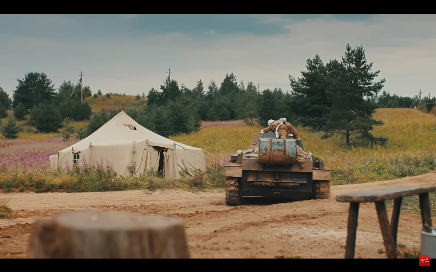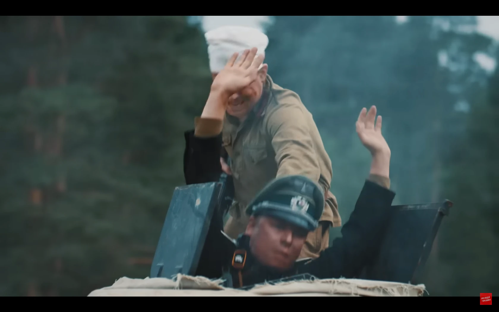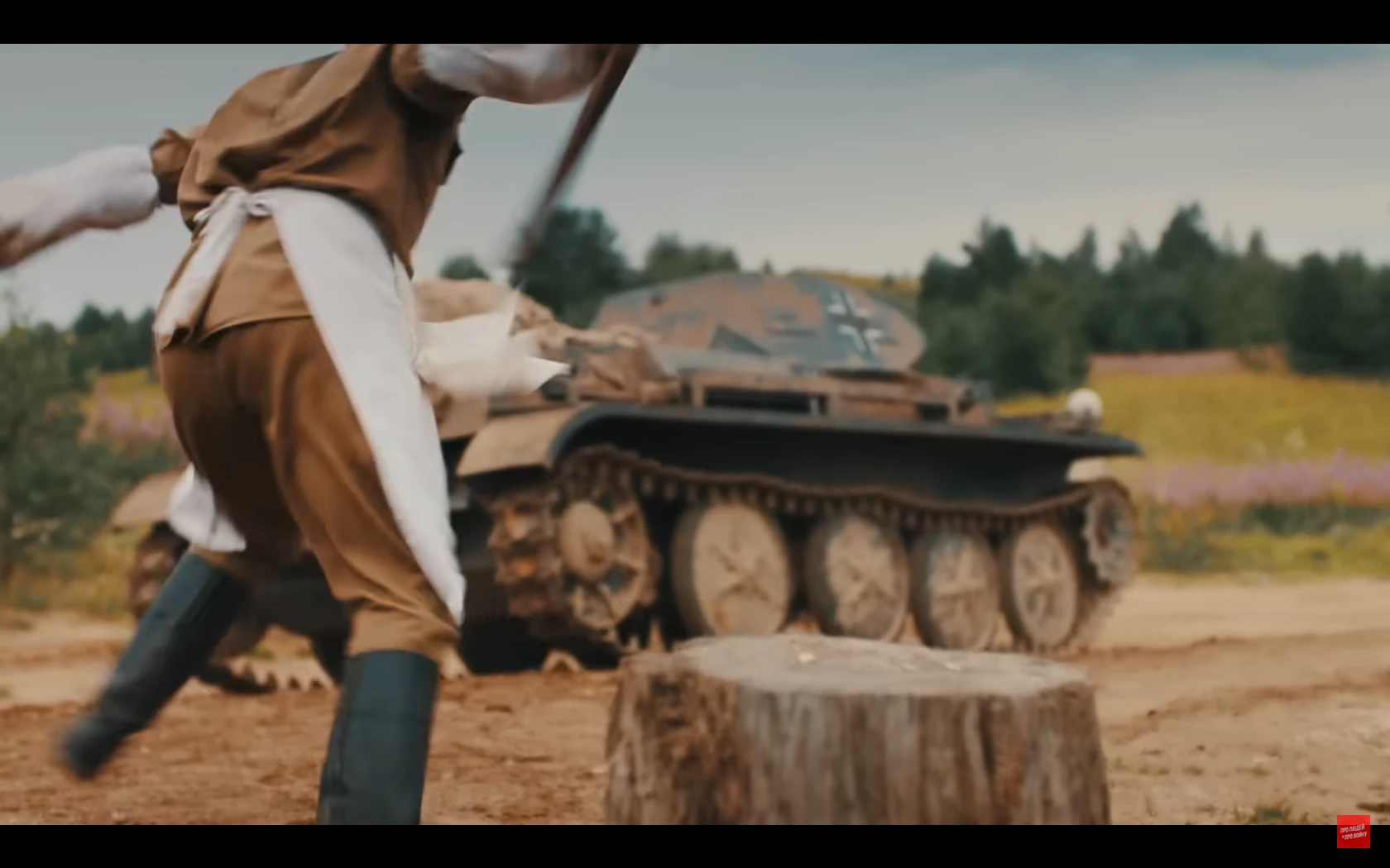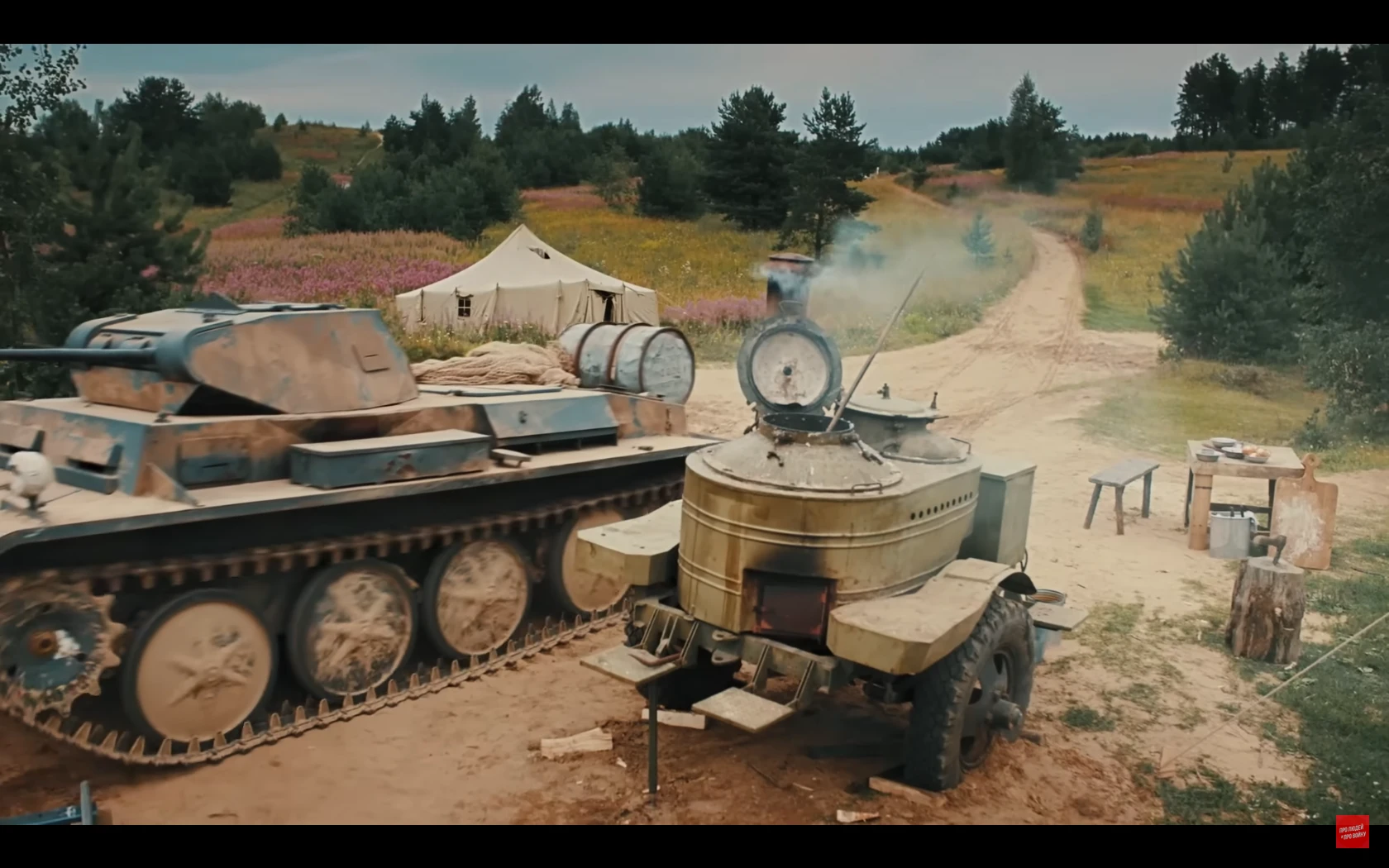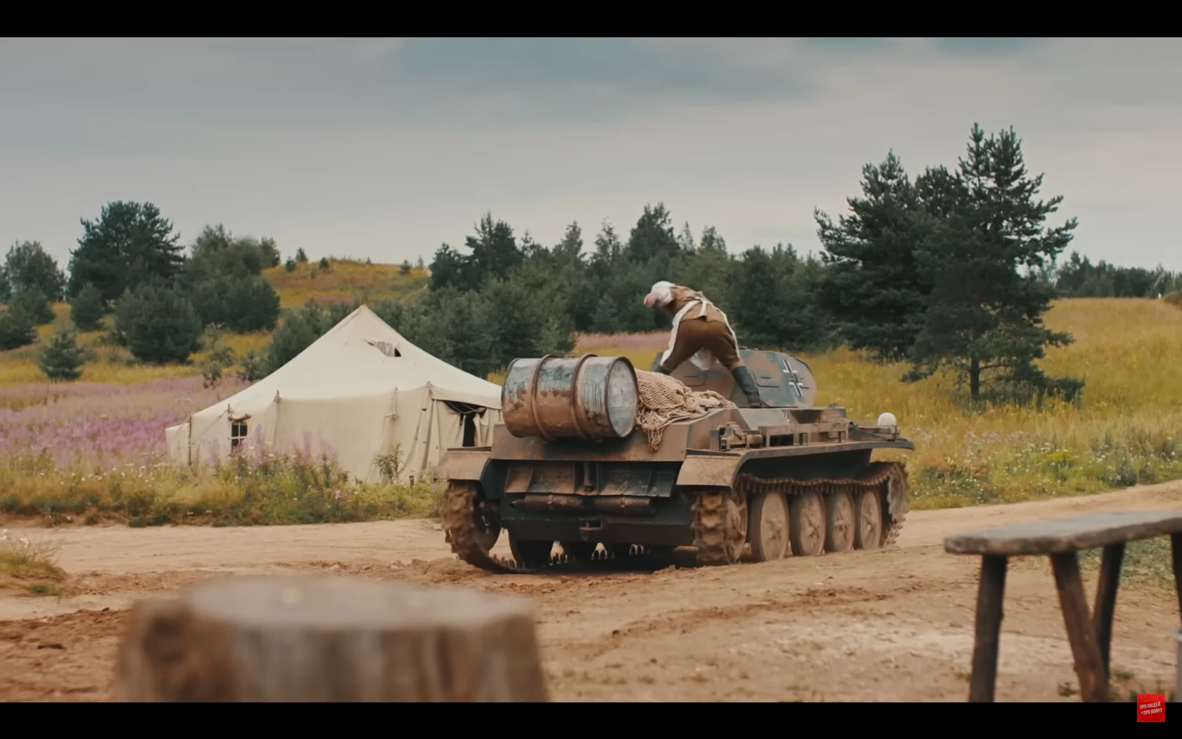 많이 스킵됐는데 저 취사병이 앞치마로 조종수 관측장 덮어서 시야 차단해버리는 바람에 전차가 천막 뒤집어씀전차장도 천막때매 시야 확보 안되고 취사병이 마치 다른 병사들 여럿 있는것처럼 사람이름 부르고 소리치고 쿵쾅대고 건초 태워서 맵게 하고 하니까 전차병들이 지레 겁먹고 항복한 거