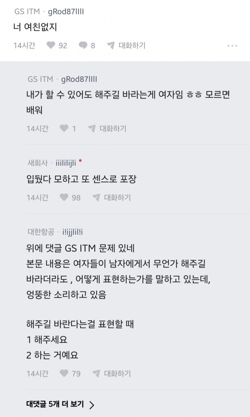 저 상황에서 남자가 여성의 말을 들어주지 않으면 어떻게 되는가? 여성이 말한 '이건 남자가 해주는 거예요.' 라는 사회적인 통용을 내세우면서 자신의 요구를 들어주지 않는 남자는 나쁜 남성으로 만들어버리는 게 되어버리는 거임. 그런데 저 여성의 발언은 실제로 사회적인 관습이나 통용이 아니라 여성의 요구를 포장한 포장지에 불구함. 다만 여러 여성들이 이런 대화 방식을 차용하기에 여성들만의 사회적 통용이 되어버리긴 했음