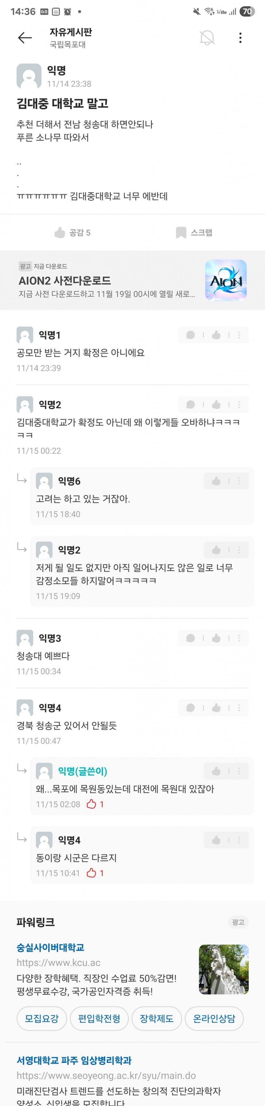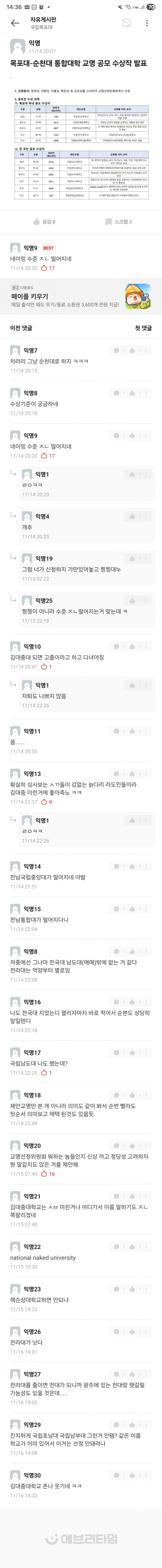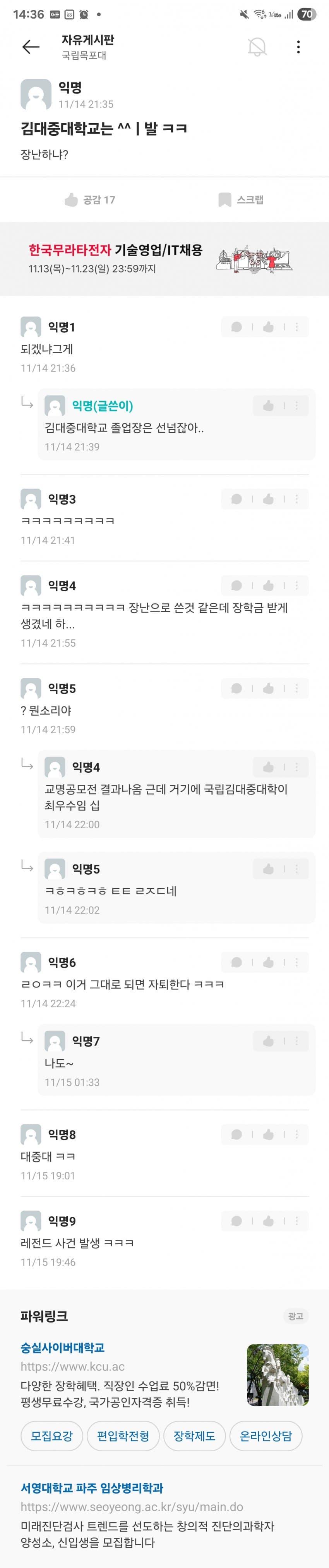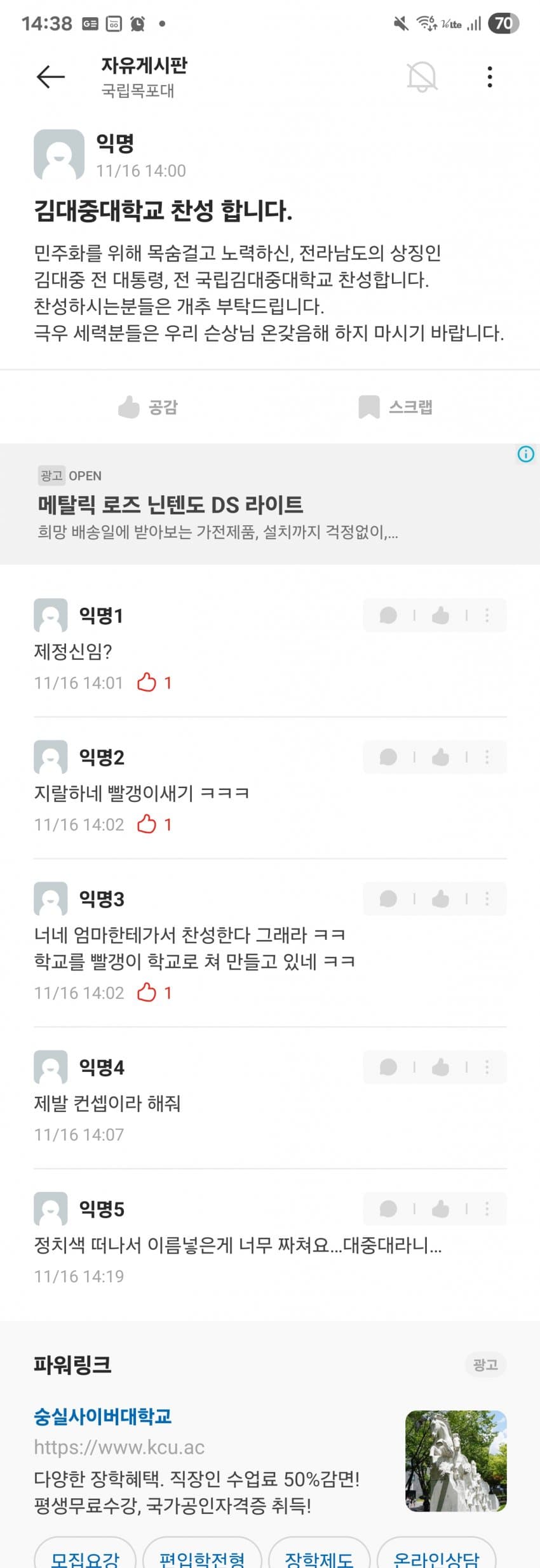 김대중대 < 써놓고 생각해보면 김포/김천/김해대 + 중부대 이딴 느낌인데 걸러내기는 커녕 오히려 시상대에 올려준 목포대 심사위원들 자질에 문제가 있지 싶음.. 외국에서 대학을 사람 이름으로 하는 경우는 있어도 김대중이라는 이름이 대학 이름으로 쓸만한 어감의 인명은 아닌데. 한자도 그렇고
