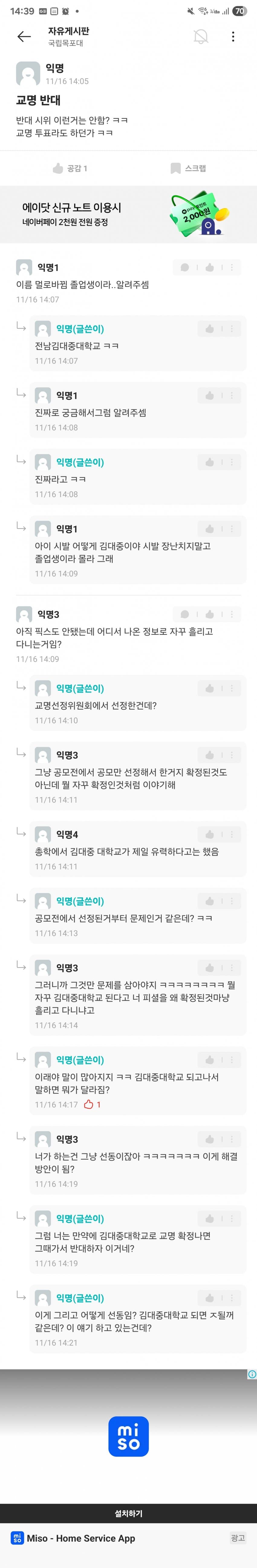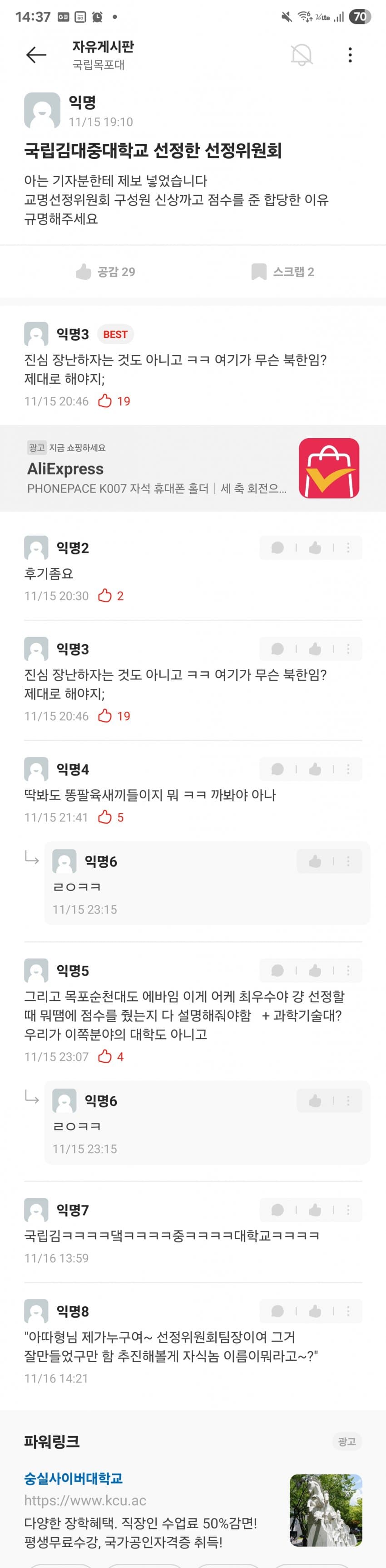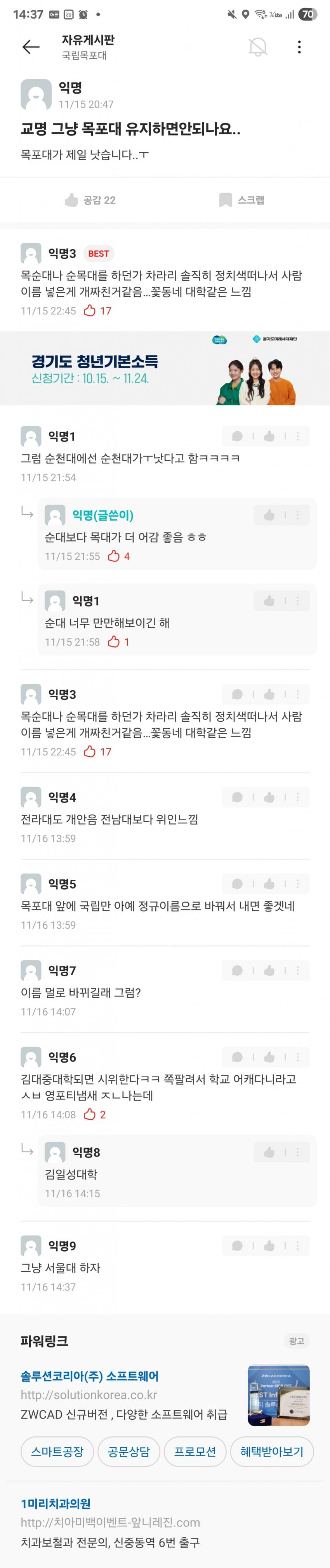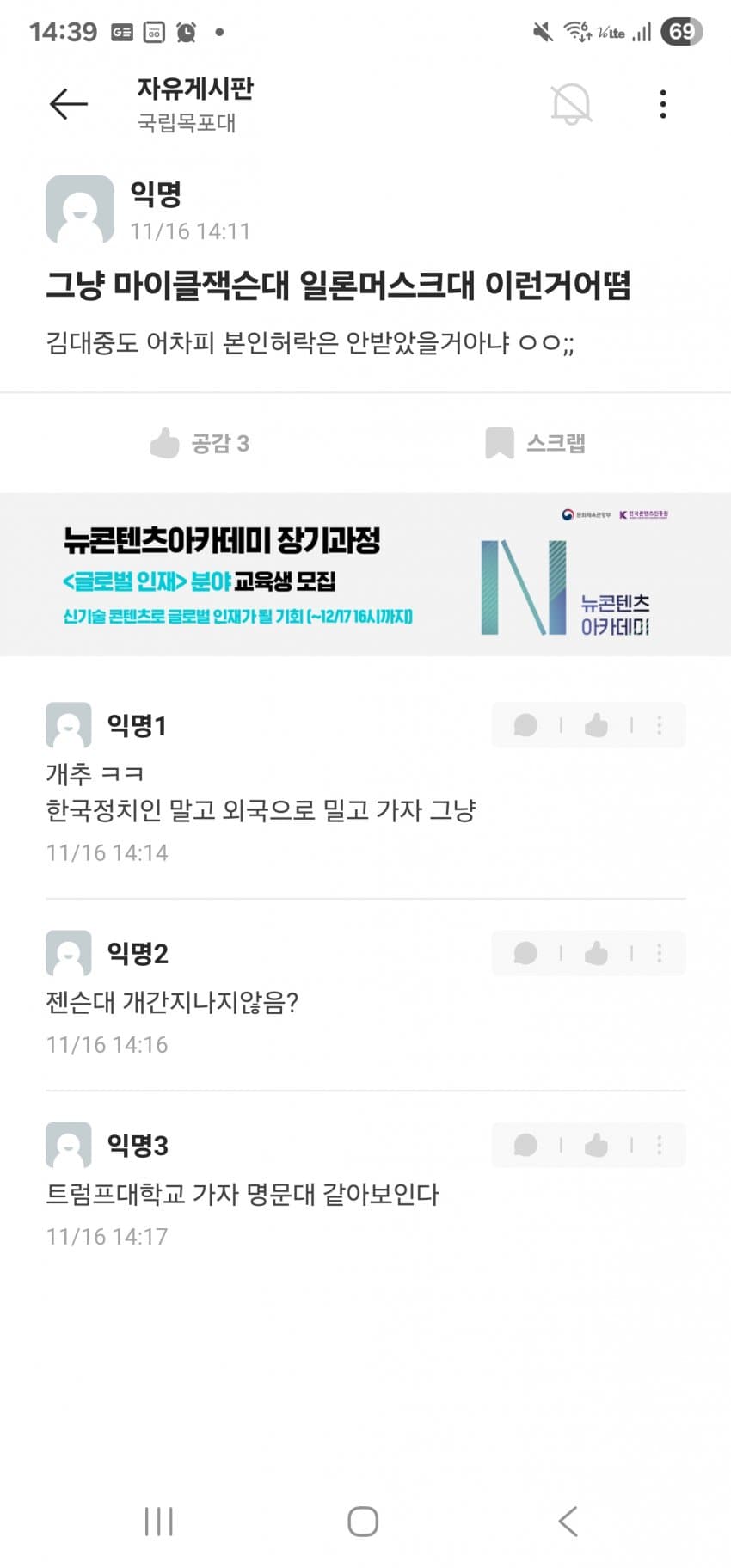 김대중대 < 써놓고 생각해보면 김포/김천/김해대 + 중부대 이딴 느낌인데 걸러내기는 커녕 오히려 시상대에 올려준 목포대 심사위원들 자질에 문제가 있지 싶음.. 외국에서 대학을 사람 이름으로 하는 경우는 있어도 김대중이라는 이름이 대학 이름으로 쓸만한 어감의 인명은 아닌데. 한자도 그렇고