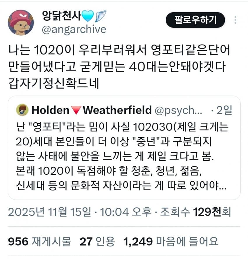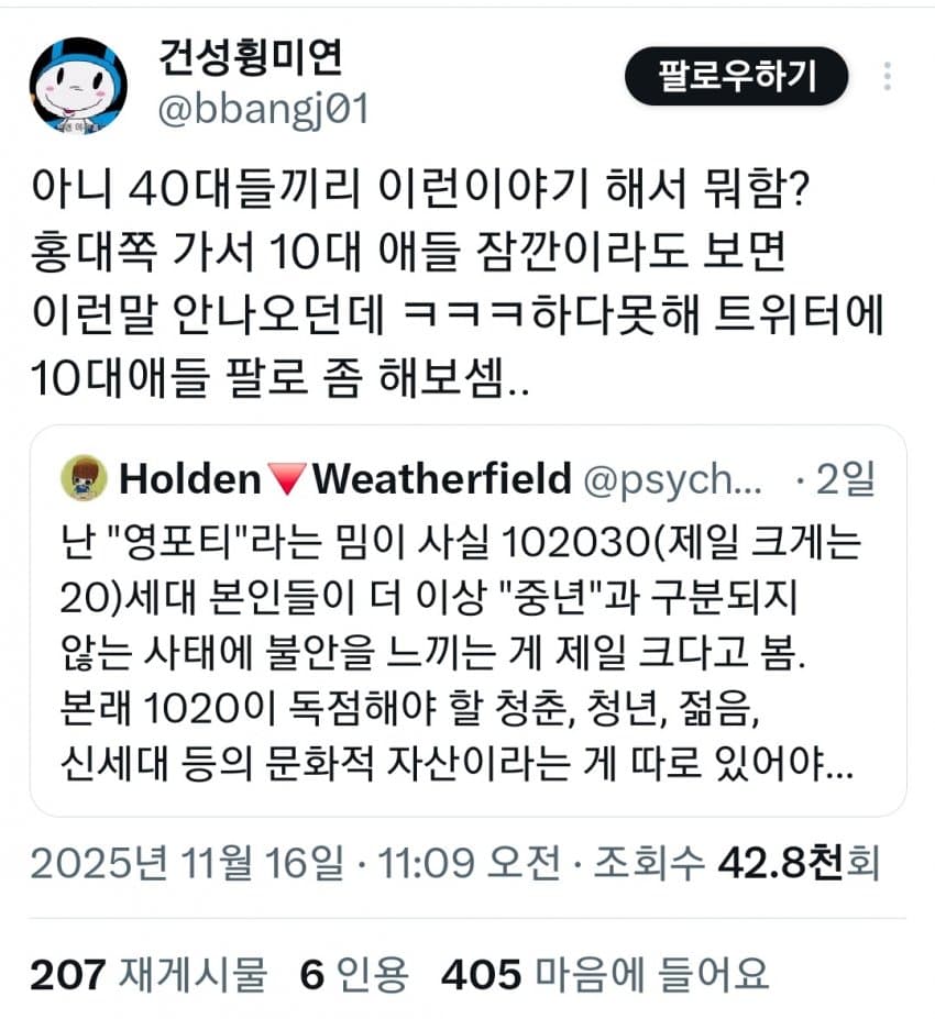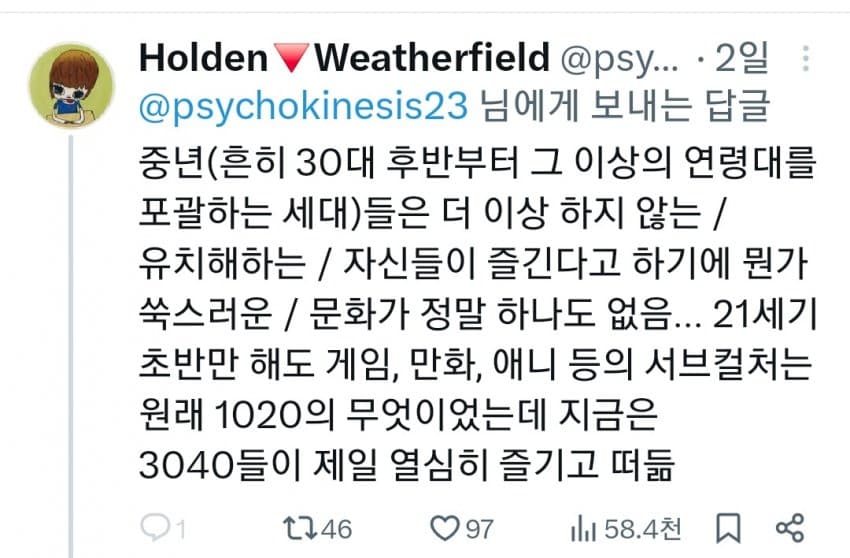 "오직 20대만 즐기는취미야말로젊음의증거인데 지금 40대도 다 누리고 있음"