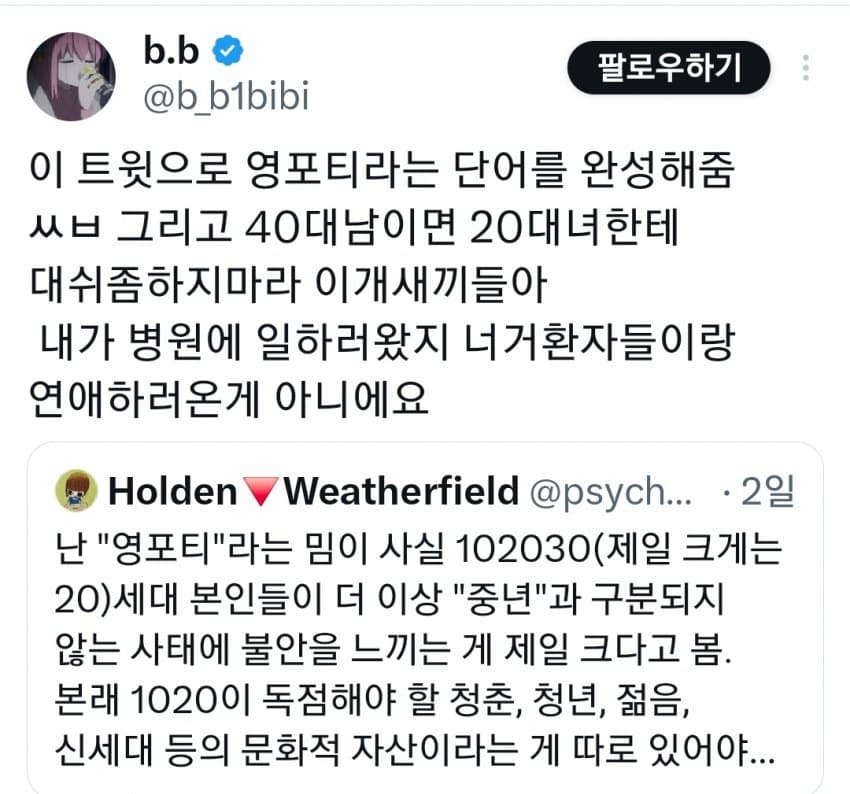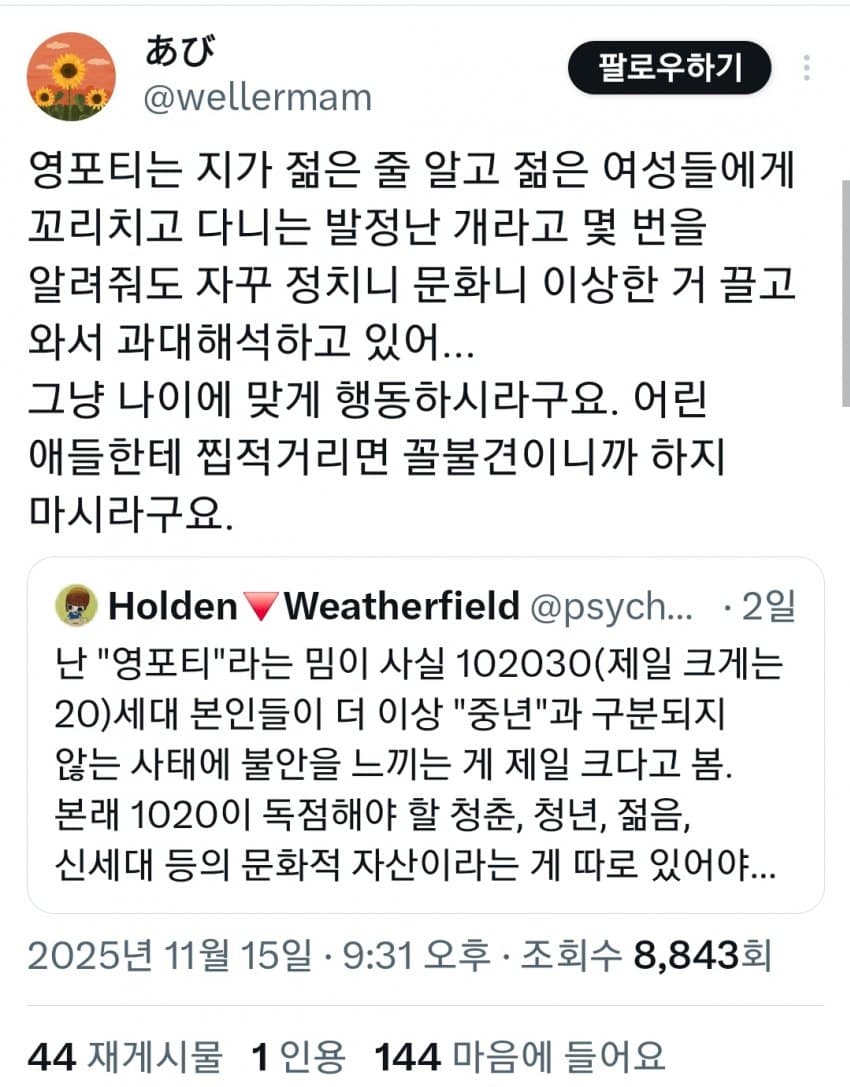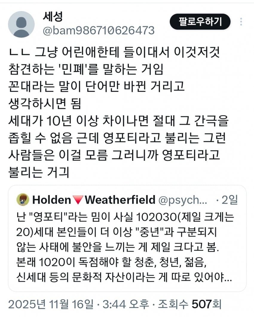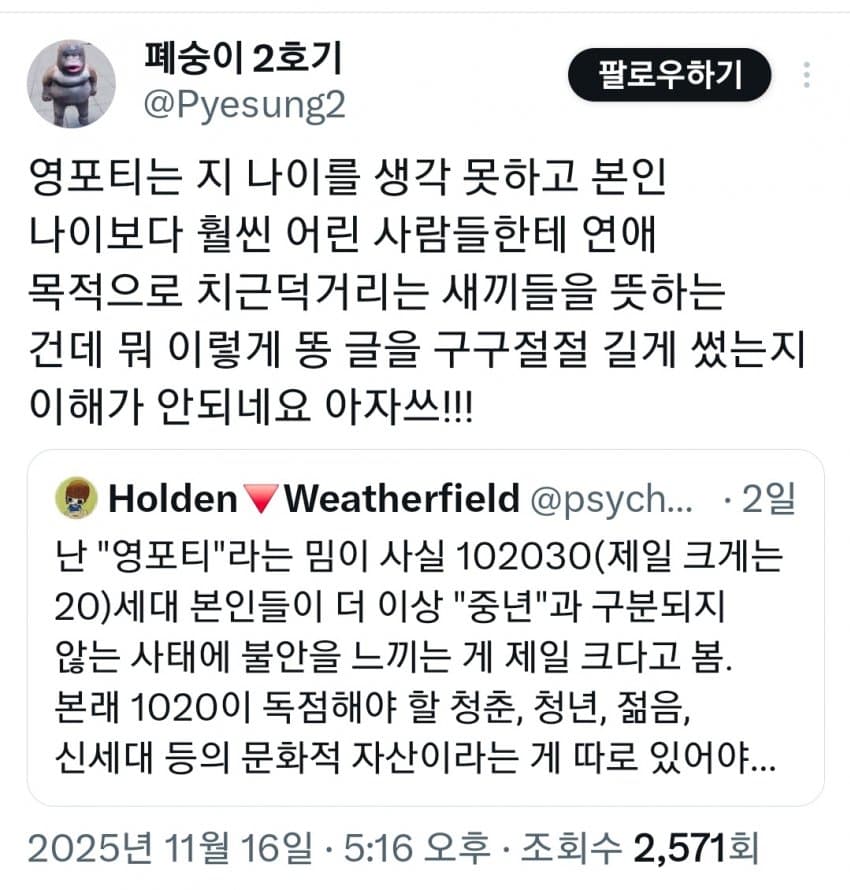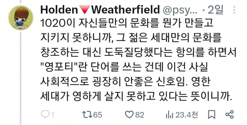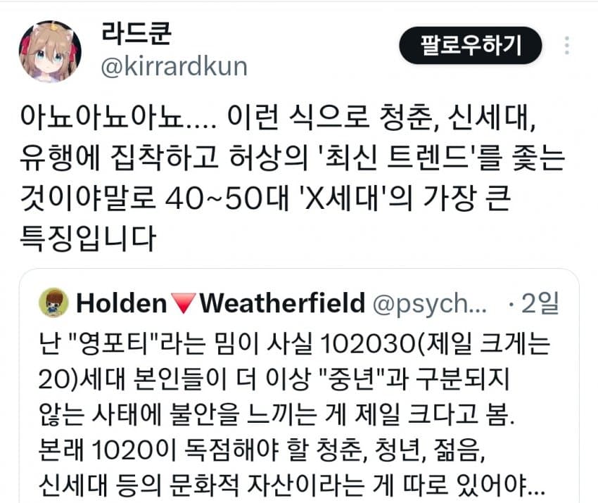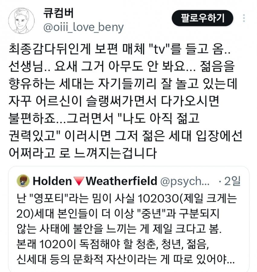 "본래신세대가독점해야 할청춘, 젊음,문화가없음"
