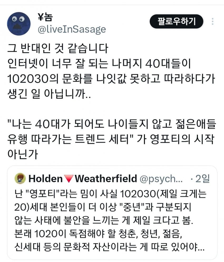 "그래서 중년들에게 문화를 도둑질 당했다는 항의로 영포티를 씀"
