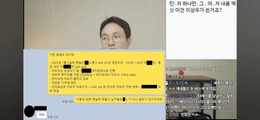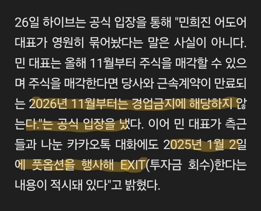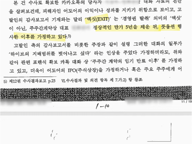 맨 위가 경찰 조사인데 풋옵션 행사 후에 정상적인 만기 5년을 채운뒤에 나간다는 의미로 엑싯을 썼다 했음 근데 실제 카톡 보면 25년 1월에 풋옵션 행사 엑싯임
