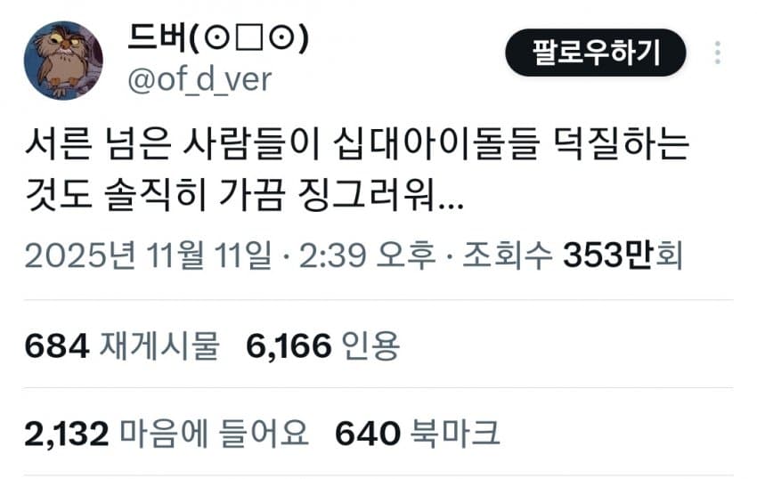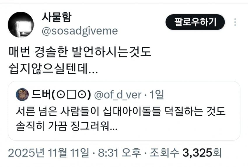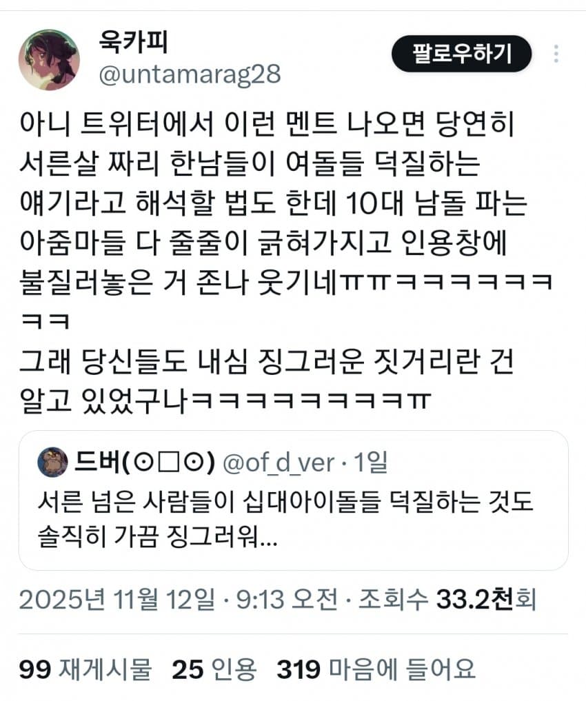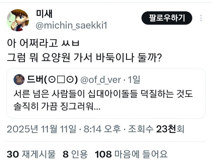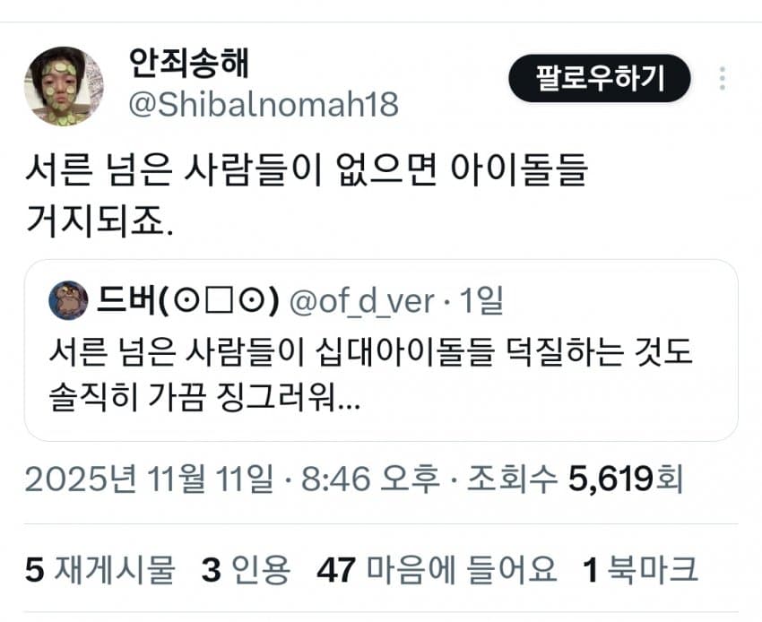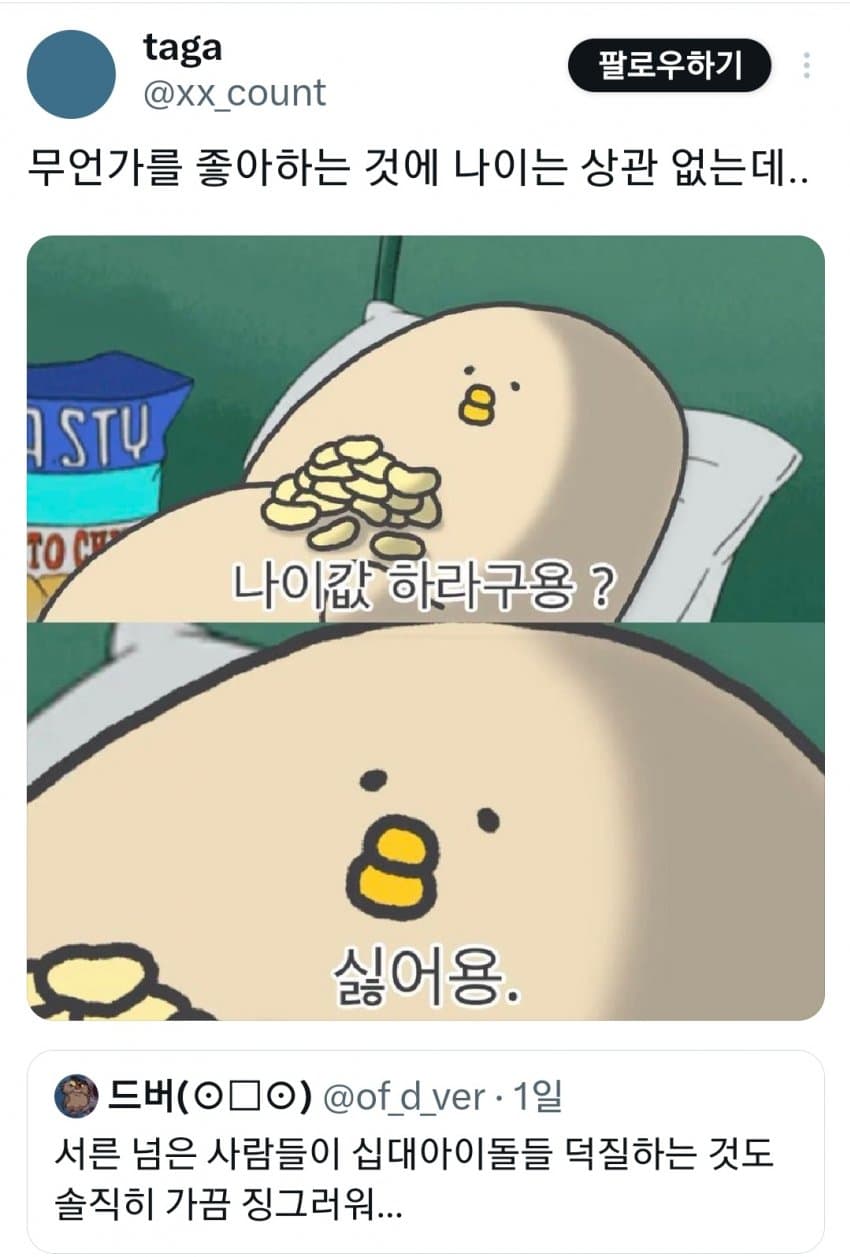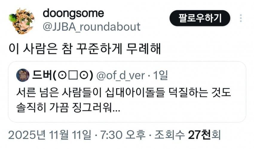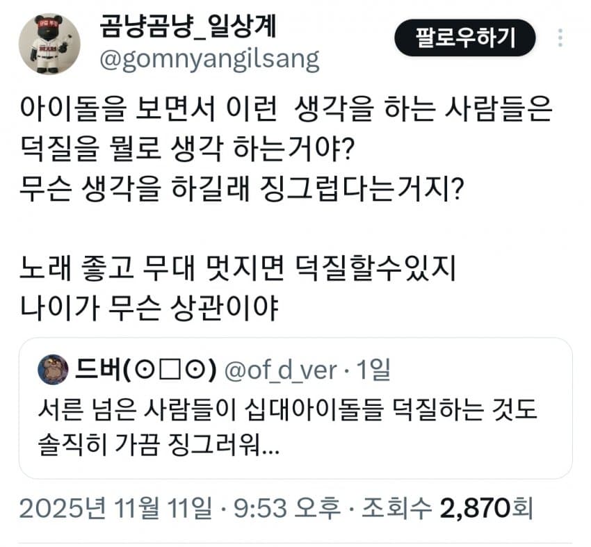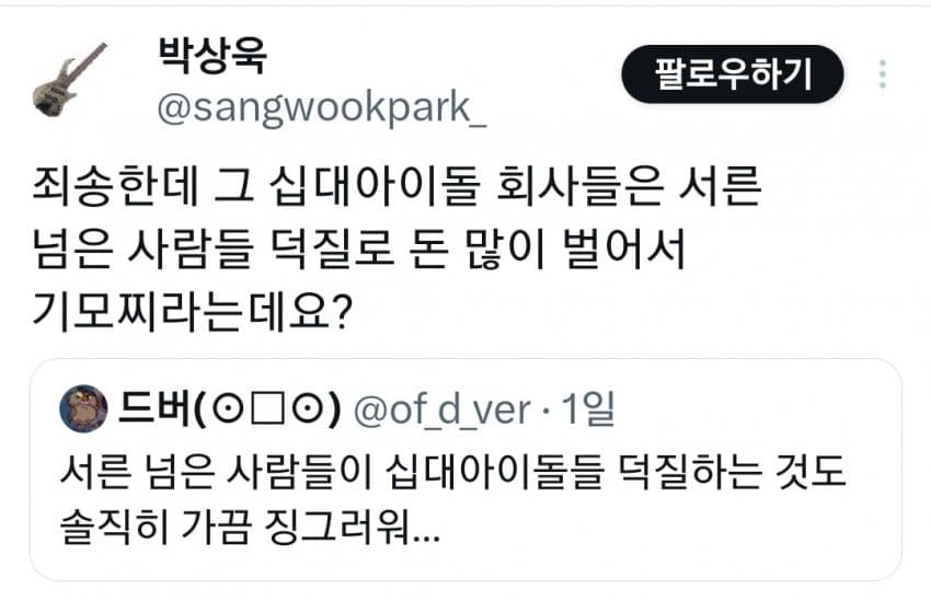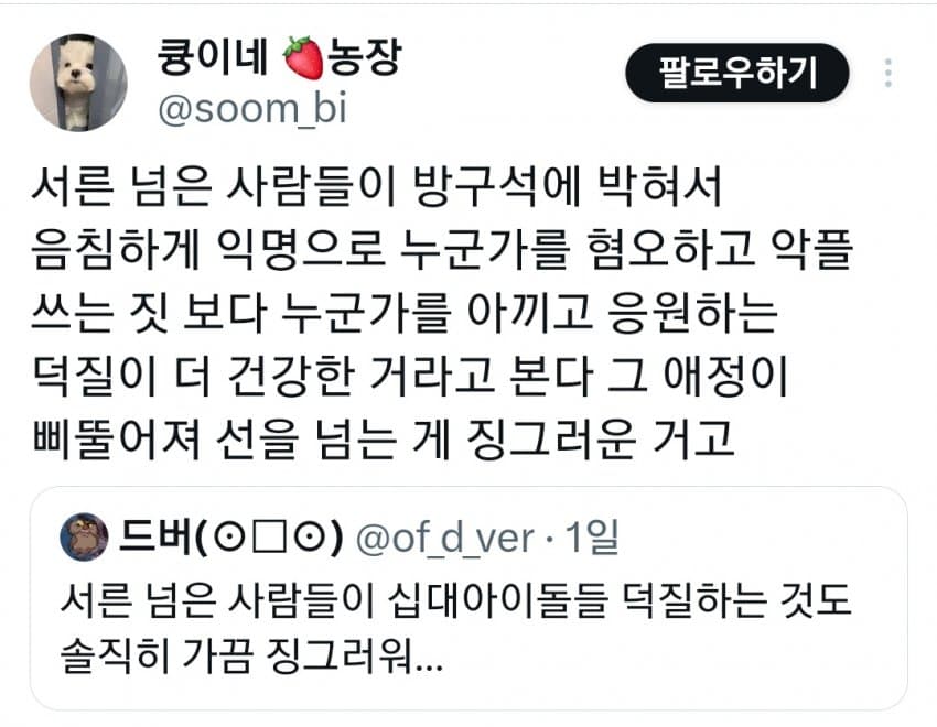 팬덤은 사회악이고 개념 안갖춰진 10대~20대초 시절을 넘어서 30살까지 그지랄하고있는건 진짜 그냥 사회의 암덩어리 그자체임