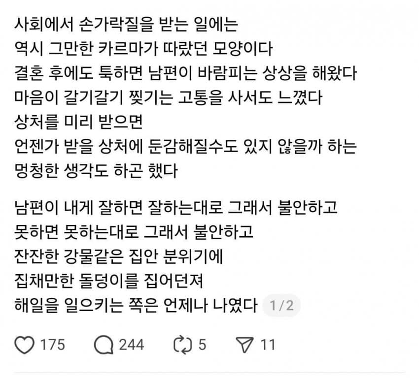 저년 저건 왜 뜬금없이 오픈하는거냐?남편한테 걸려서저렇게 감정에 호서허며 글쓰는거임?