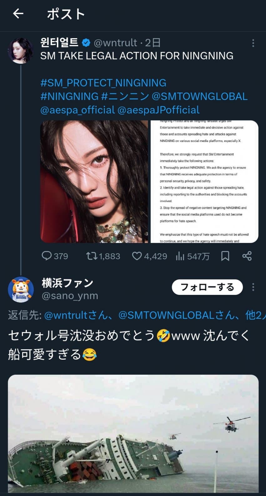 에스파 팬들이 이번 사태에 대해 비판적인 의견을 내니까 쪽본에서는 세월호 사진까지 올리며 갑자기 한국까지 싸잡아 선 넘는 조롱하고 있다는 거임
