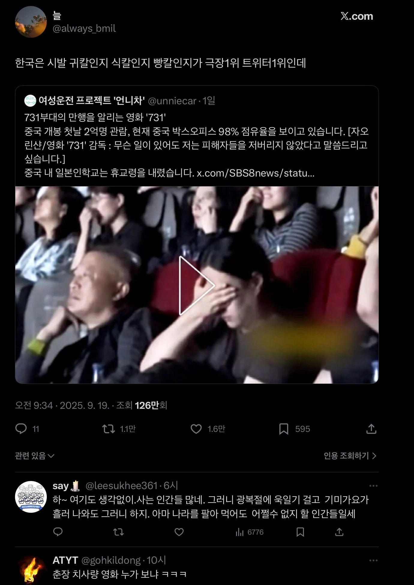 실베에서 작업하는 중국 애들이 봐주면 되잖아 니들 댓글 달고 돈 받는데 애국을 위해서 영화 표 한장도 못 사? 영혼이라도 보내야지