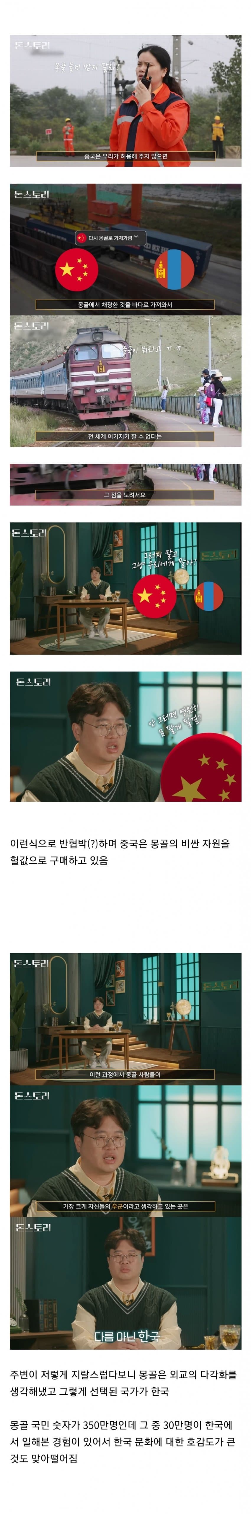 몽골이 중국을 죤나 싫어하는 이유는 저것도 있긴하지만, 본문내용이 주이유 아니고 몽골 부패기득권층이랑 중국이랑 손잡고 채굴권이나 이득권을 가져가기 때문이야.. 물론 자원도 헐값에 가져가고.. 다른 한쪽의 큰이유는
