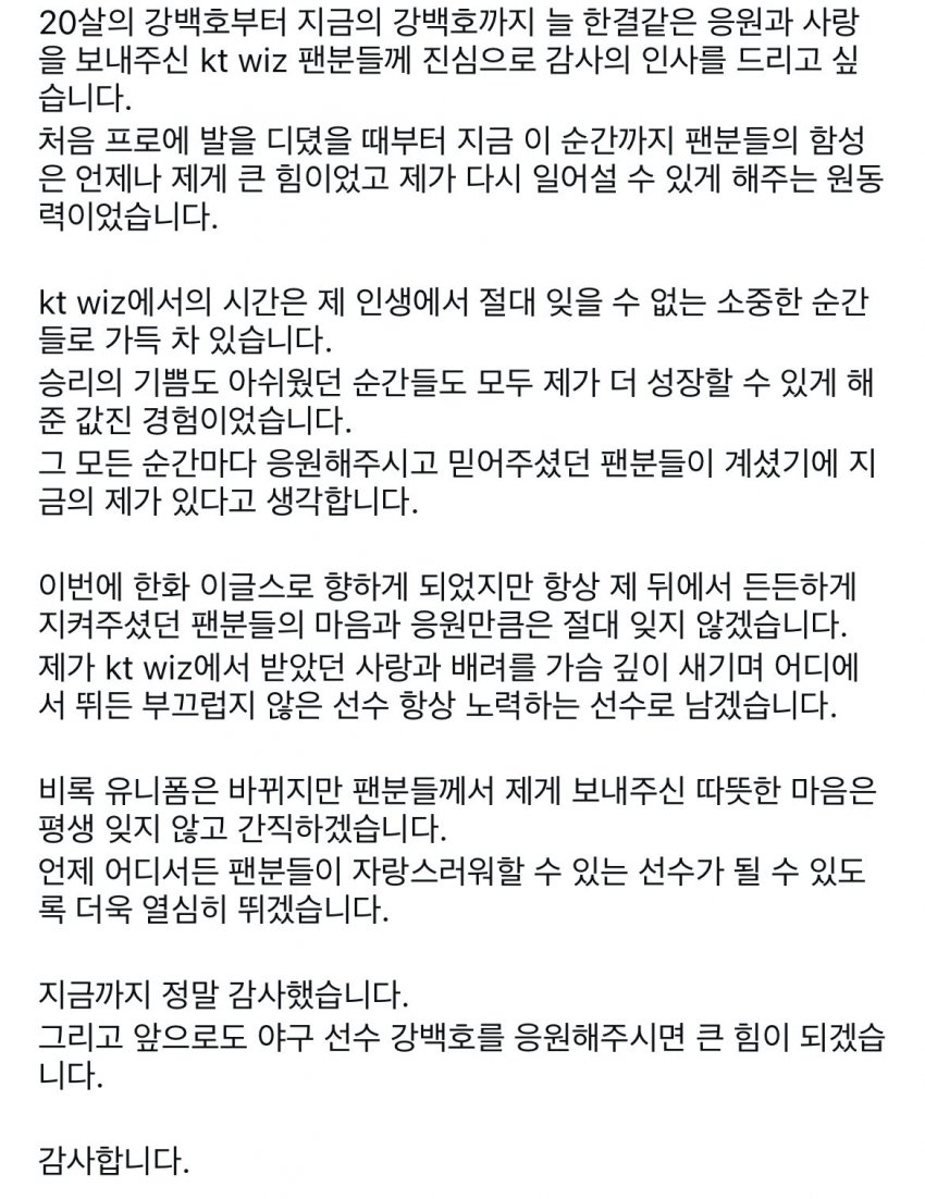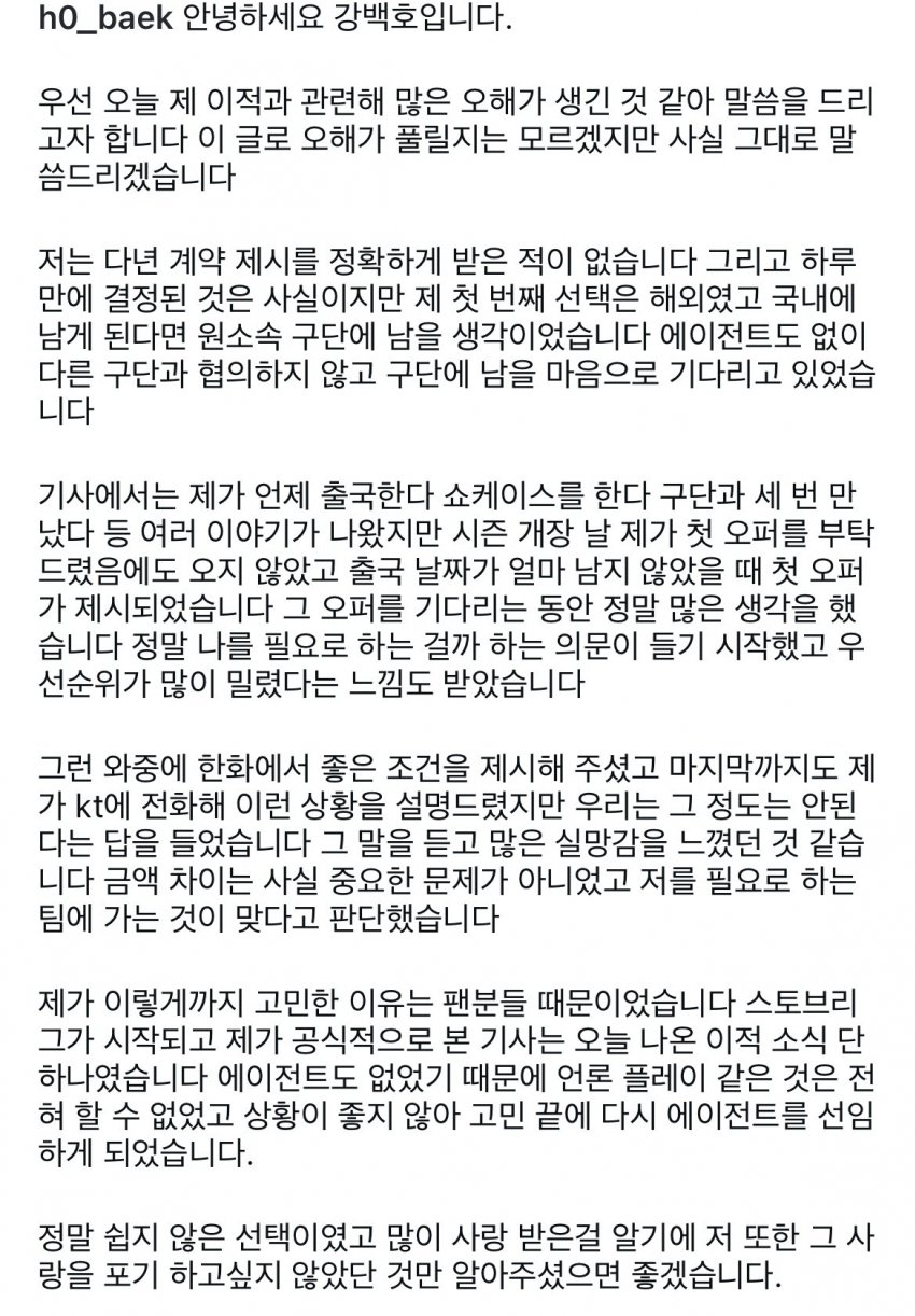 아니 자꾸 팬 어쩌고 포장하려는 개소리는 왜하는거임?? 첫오퍼 제시때 자기를 필요로 하는지 의문=금액, 한화에서 좋은조건 제시=금액, kt에 한화 조건 알렸더니 그 조건 불가=금액, 앞에 다 말해놓고 뭔 금액차이는 중요한게 아니였고 자기를 필요로 하는 팀(금액)에 가는게 맞다는 역겨운 포장은 왜 하는거임???