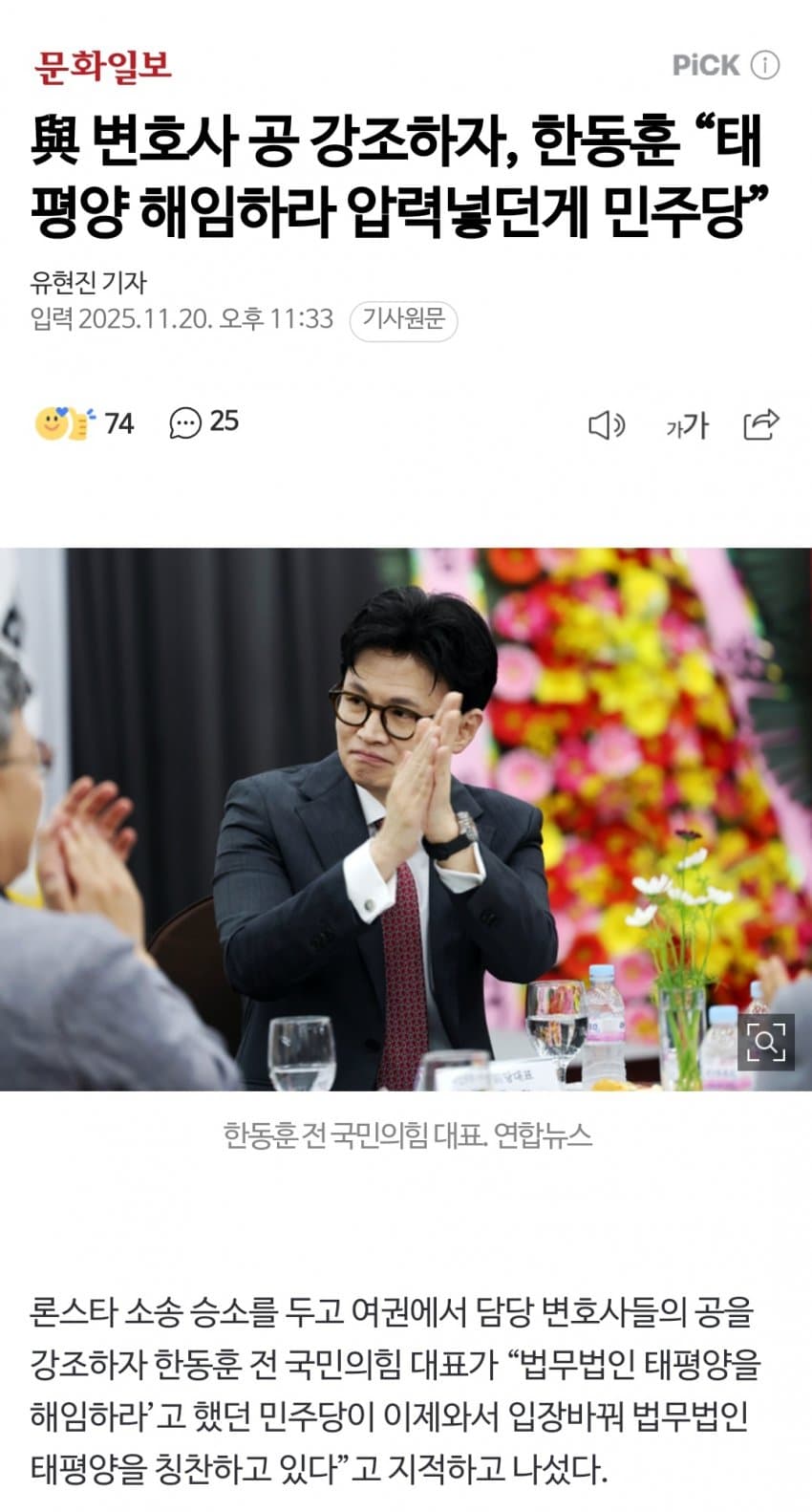 與 변호사 공 강조하자, 한동훈 “태평양 해임하라 압력넣던게 민주당”
