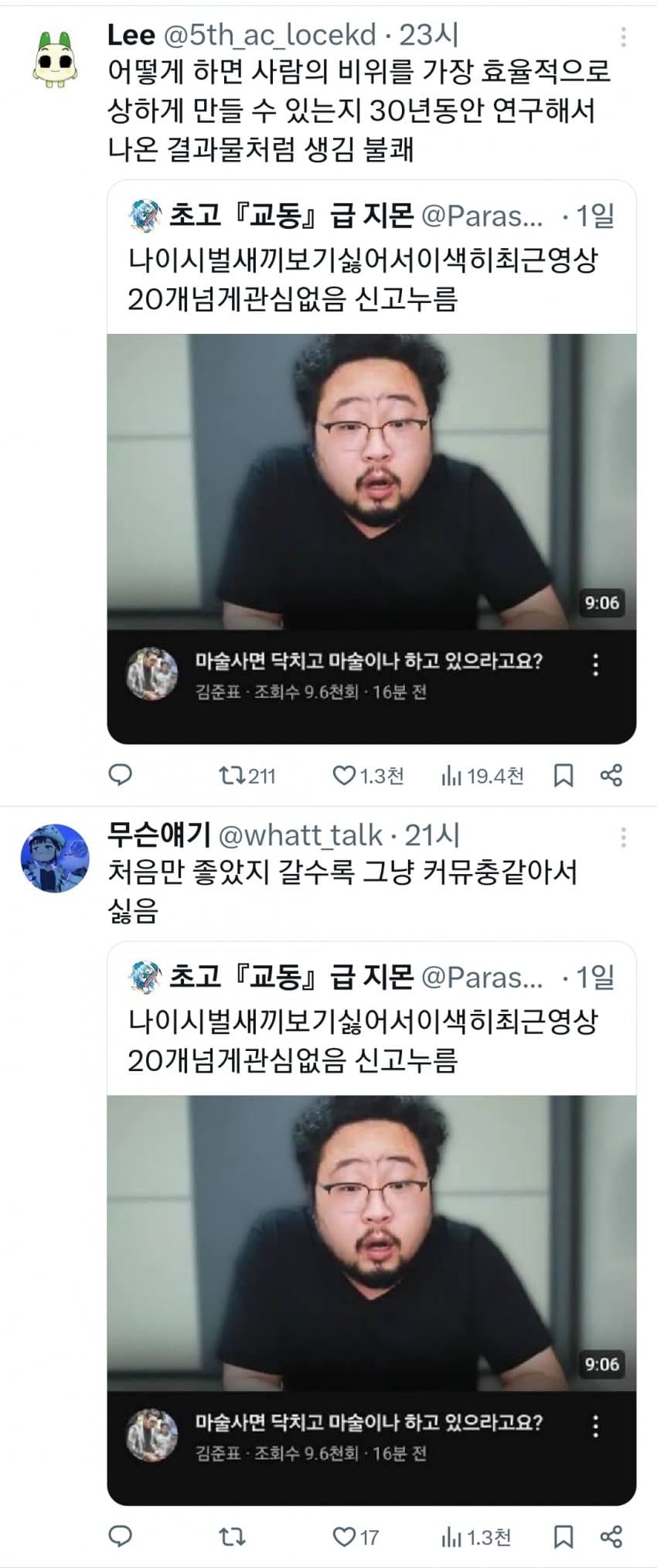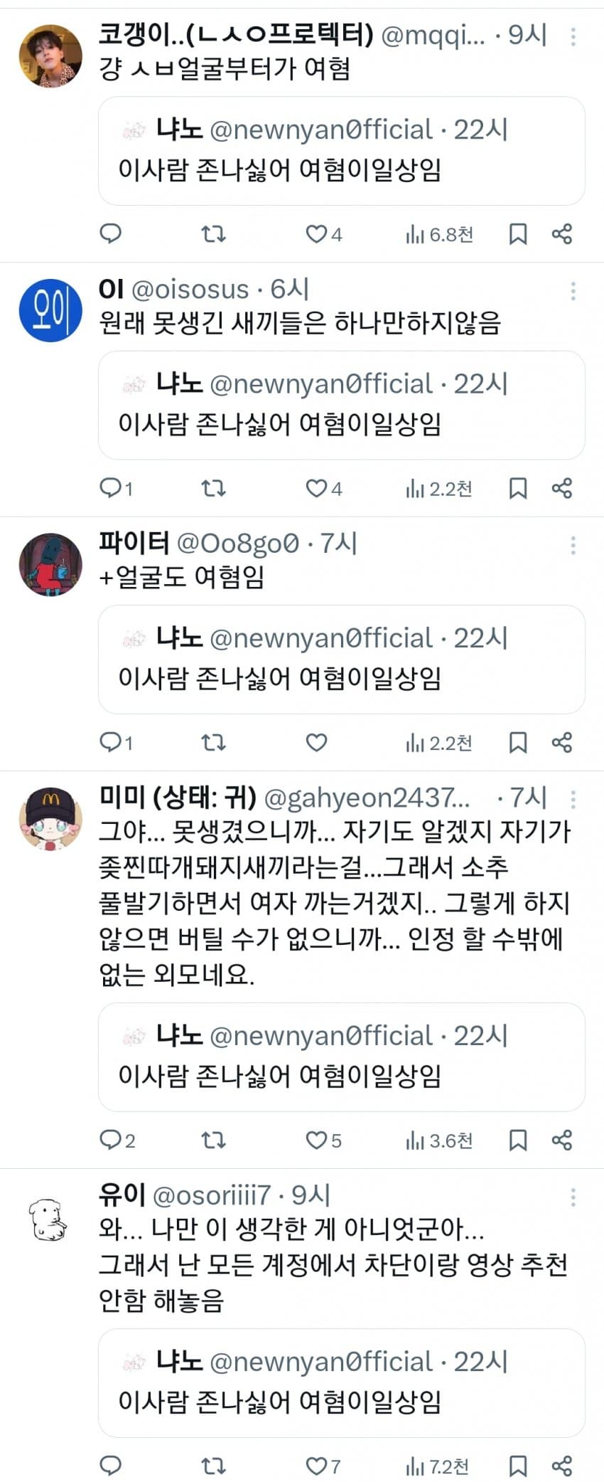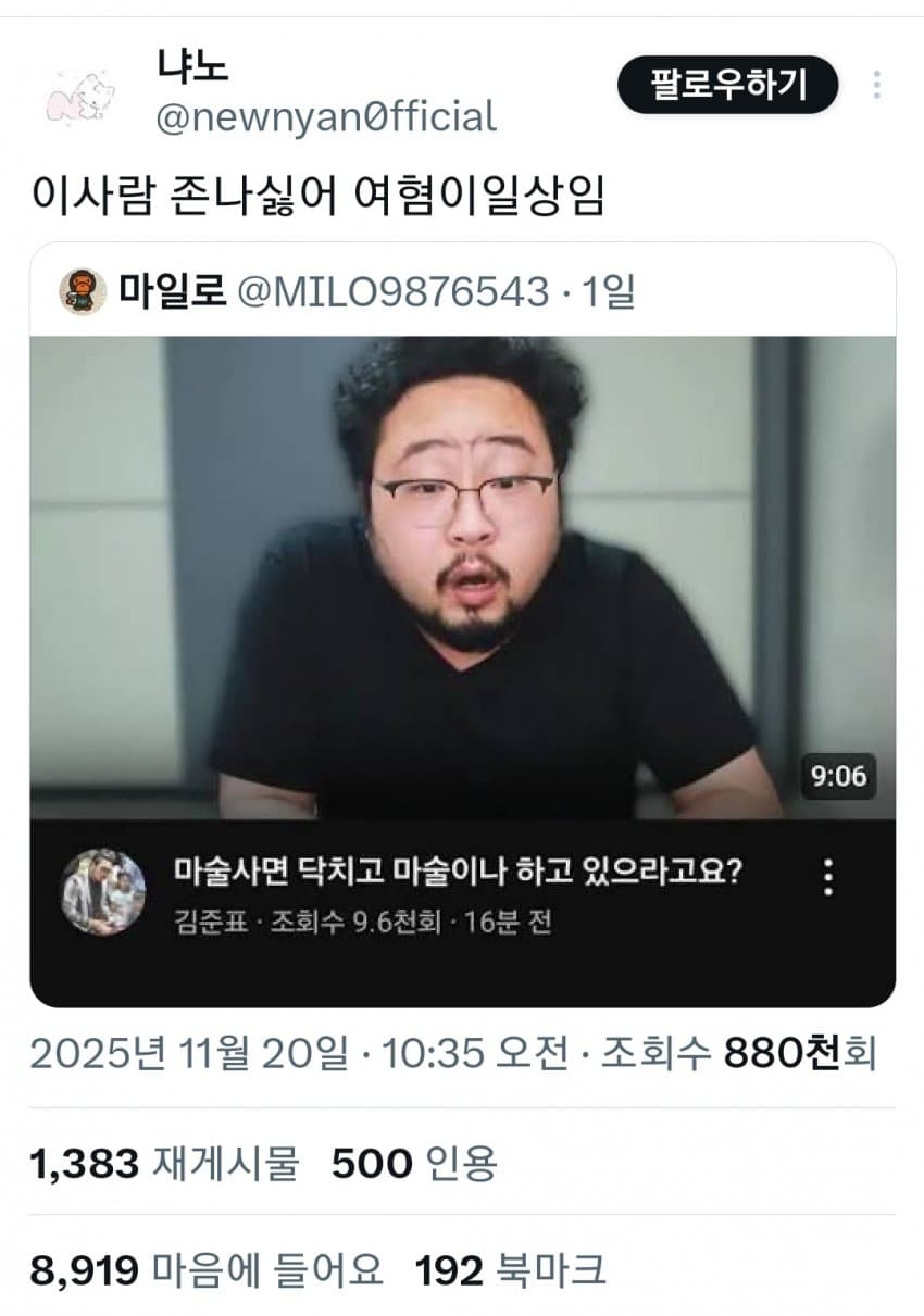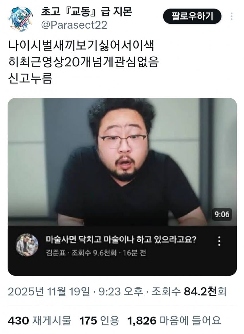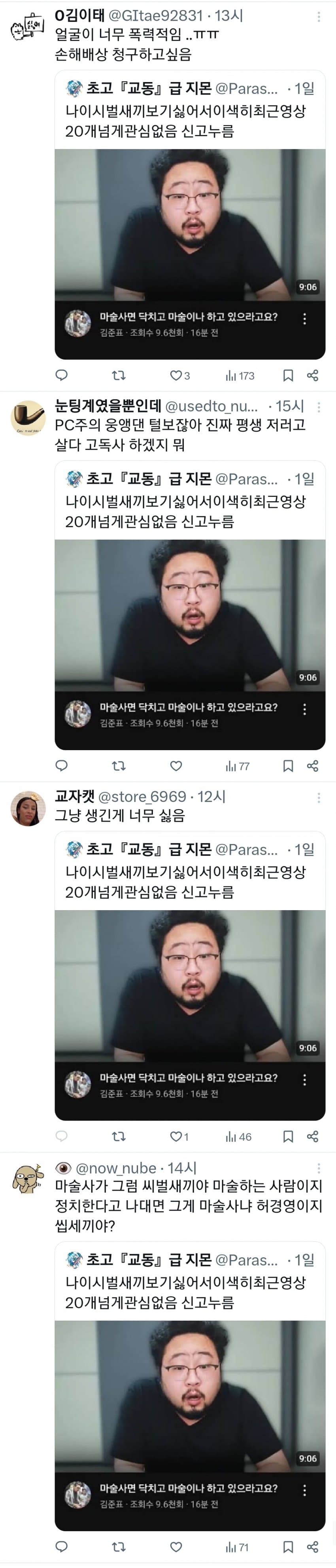 페미들한테 까이고 말고간에 쟤 인성 더러워서 맘에 안듬. 마술사 시절부터 인성논란 있었는데 그땐 마술사는 마술만 잘하면 된다 인성필요없다 식으로 팬들이 쉴드라도 쳐줬고 마술실력만 놓고 보면 볼만했지만 이젠 인플루언서니까 그런 쉴드도 안통하고 과거 인성의 바닥을 보여줬던 경험때문에 호감도 안가고 보고싶은 생각도 안들어서 구취하고 관심없음누른지 오래임