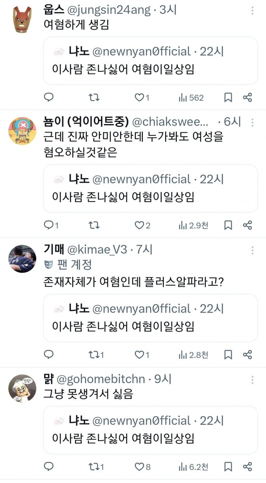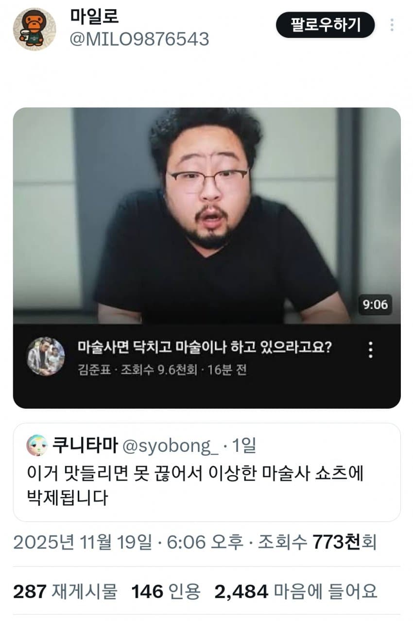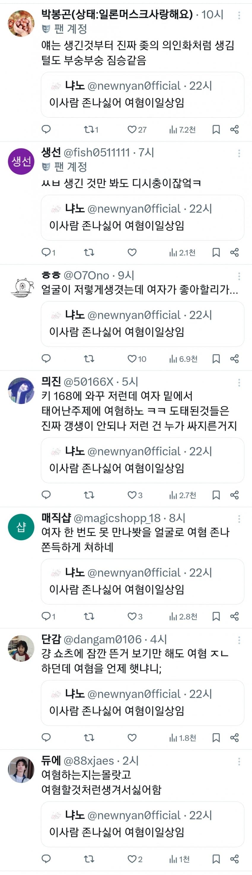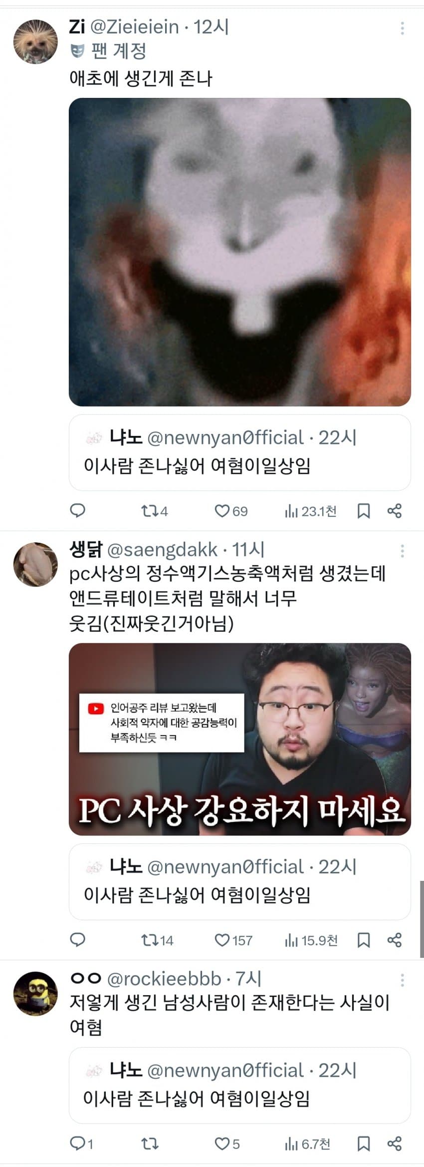 페미들한테 까이고 말고간에 쟤 인성 더러워서 맘에 안듬. 마술사 시절부터 인성논란 있었는데 그땐 마술사는 마술만 잘하면 된다 인성필요없다 식으로 팬들이 쉴드라도 쳐줬고 마술실력만 놓고 보면 볼만했지만 이젠 인플루언서니까 그런 쉴드도 안통하고 과거 인성의 바닥을 보여줬던 경험때문에 호감도 안가고 보고싶은 생각도 안들어서 구취하고 관심없음누른지 오래임