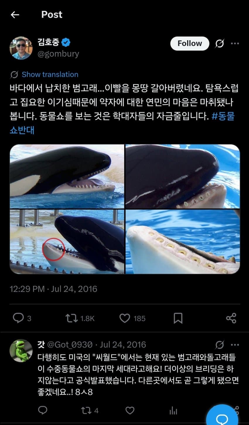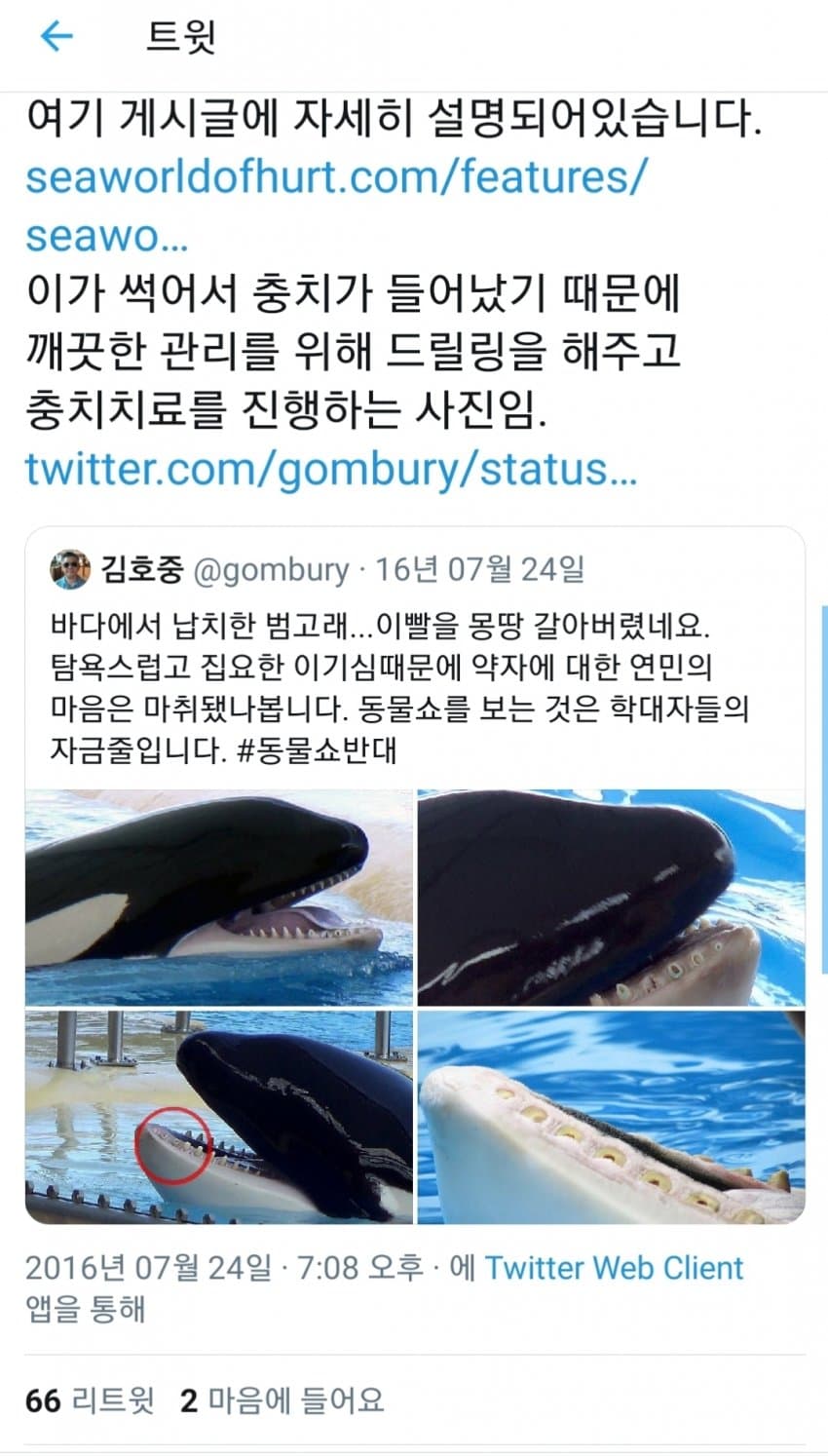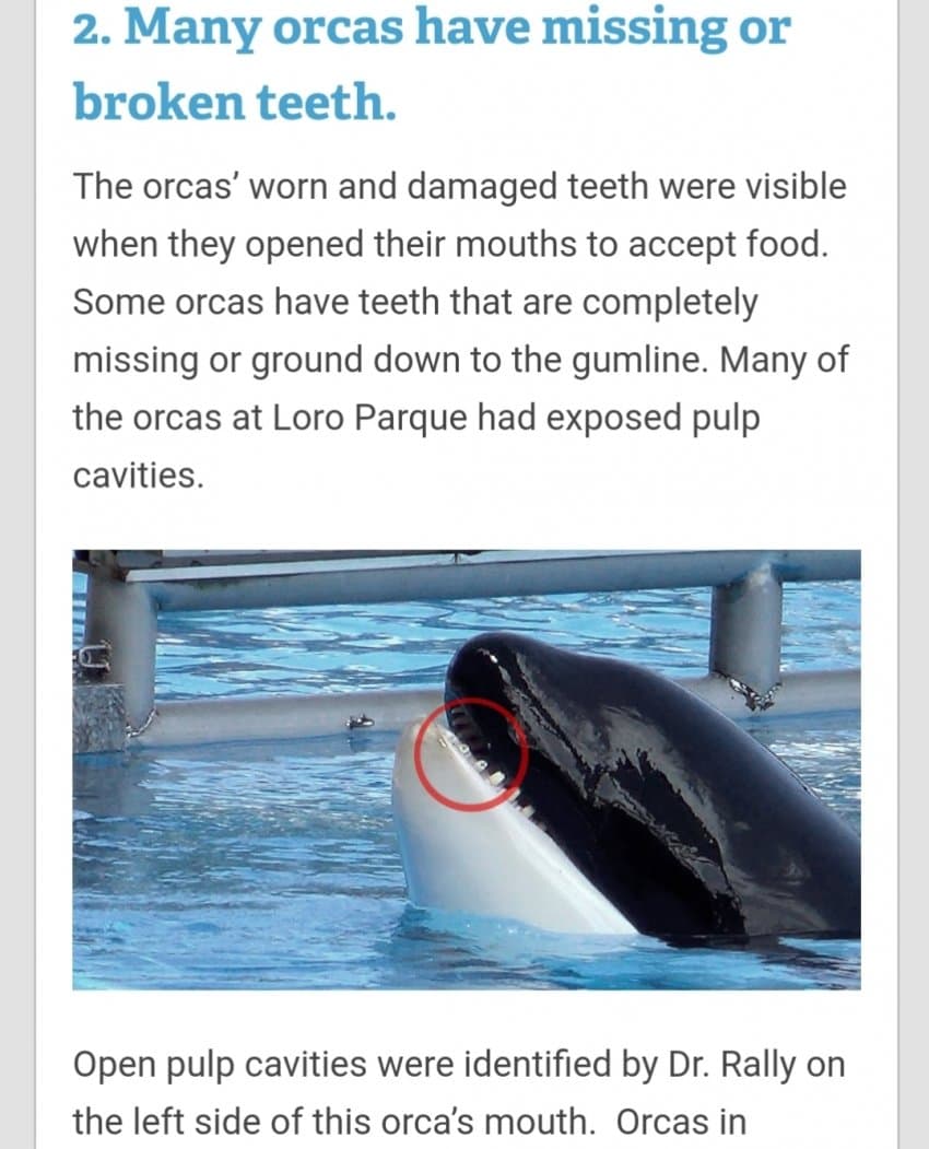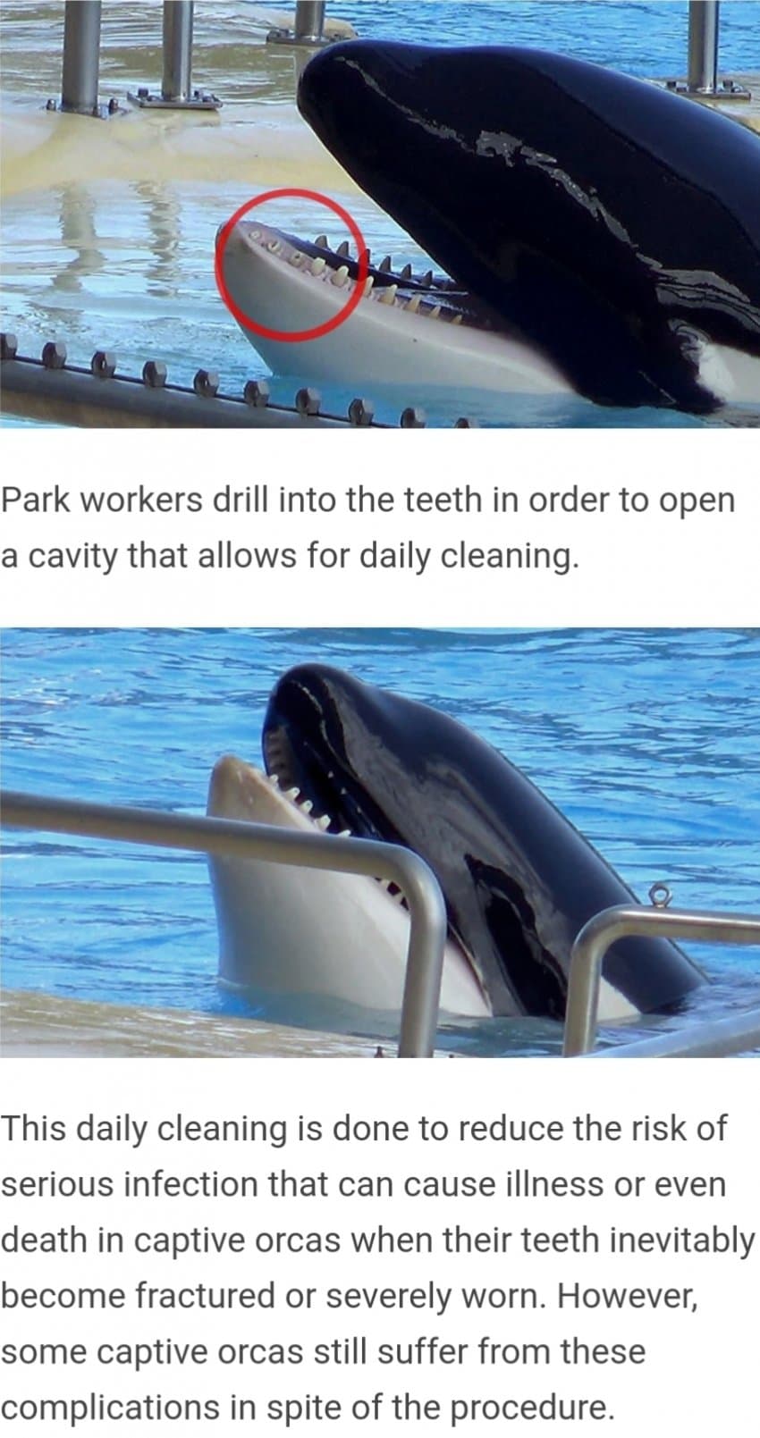 인간들이 탐욕스럽게도 고래 쇼를 하기 위해 범고래의 앞니를 전부 갈아버렸다고 한다...