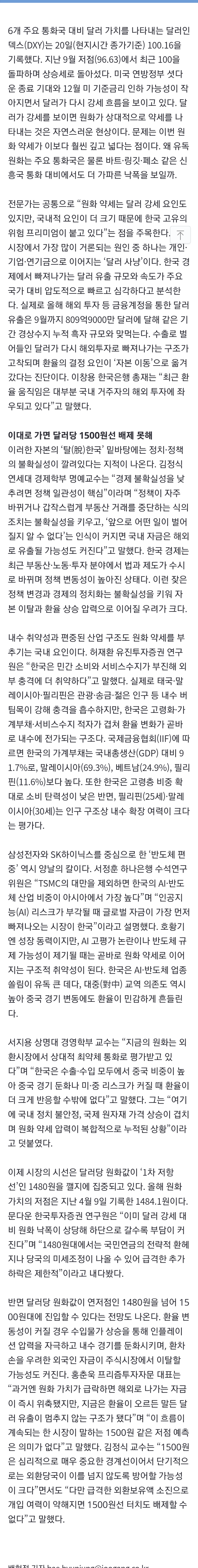 여러가지 원인이 있어일단 수출기업들이 국내로 돈을 안가져와 무슨 말이냐면 외화를 원화로 바꾸지 않으니 경상흑자니 뭐니 소용이 없어또 다른 이유로는 경기를 부양한다고 돈을 너무 많이 찍고 있어서 시장금리가 상승하고 채권가격이 떨어지니 채권에 투자하는 외국인들이 원화 채권을 매도하고 자국 통화로 환전하고 있어 그 외 여러가지 원인이 있지만 정부로서는 어떻게 하기에 참 애매한 상황이야. 하지만 상황이 이렇다고 원화가 박살나는걸 보고만 있는건 아니라고 생각해