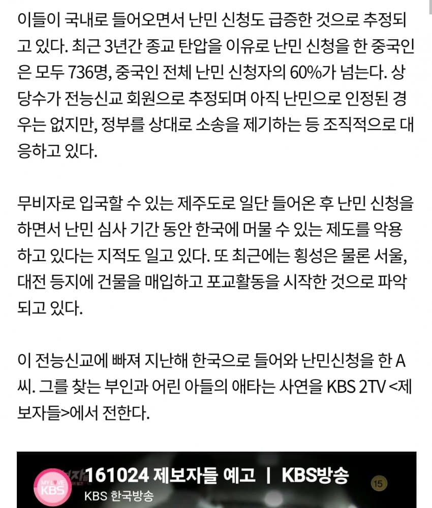중국 공산당의 종교 탄압을 이유로 2013~16년 3년동안만 736명이 한국에 난민 신청을 했고, 이는 당시 중국인 전체 난민 신청자의 60%에 해당하는 수치임..