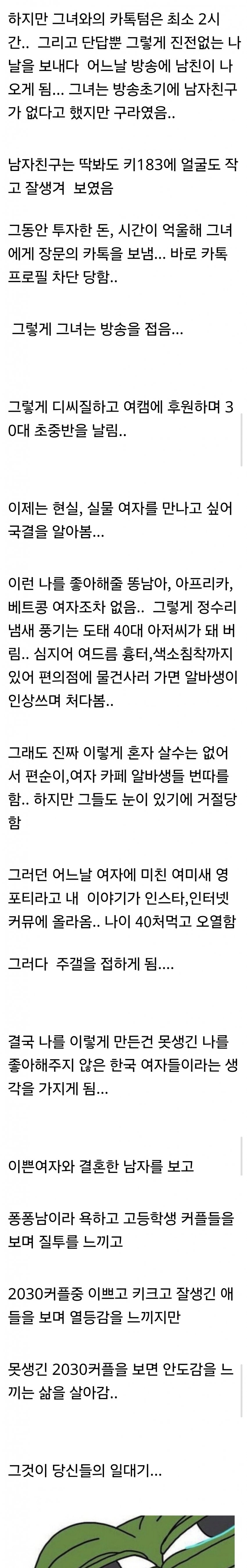 필력이 너무 부조카다추정컨대 40찍고 갑자기 현타가 막 몰려와버린 아줌마의 소설인듯뭔가 좀 그럴 듯 해야 낚여줄 마음이 손톱만큼이라도 생길 텐데너무 노잼이라 못 낚여주겠네머리가 너무 나쁘면 분탕짓도 제대로 못하는 거임