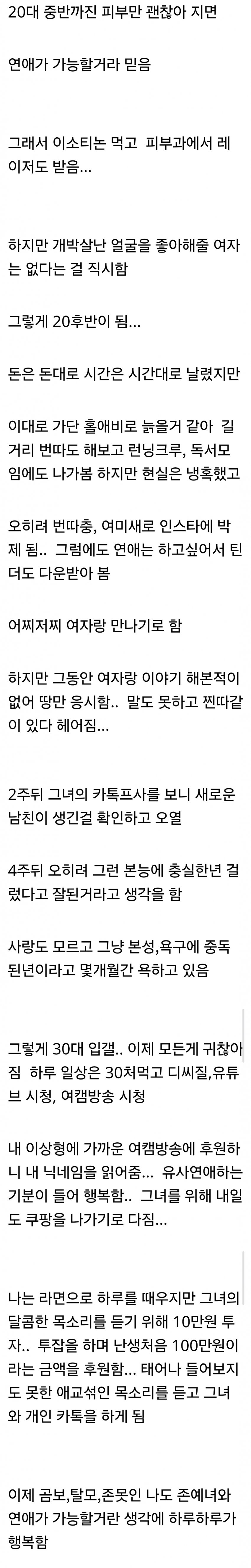 남자도 여자도 20대 초반에는 어떻게든 연애하고 싶어서 눈을 스스로 낮추고 있는데 못 하는 건