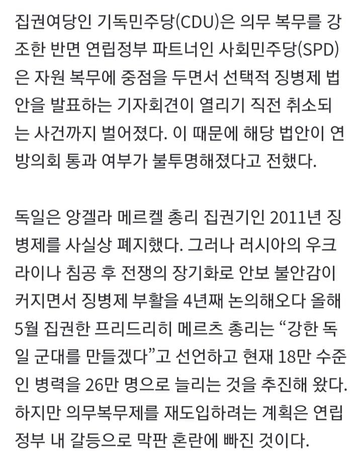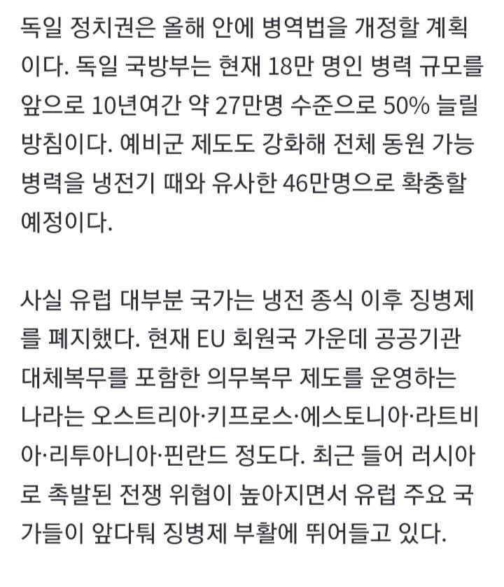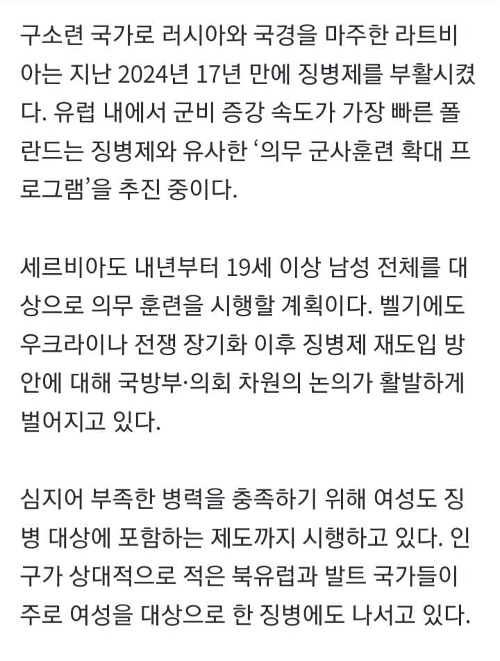 어차피 저출산으로 병력 20만명대로 줄고 존버한 북괴가 도발 시작하면 할수 밖에 없슴. 여성징병 안되면 외국인 용병 받아야 할껄?