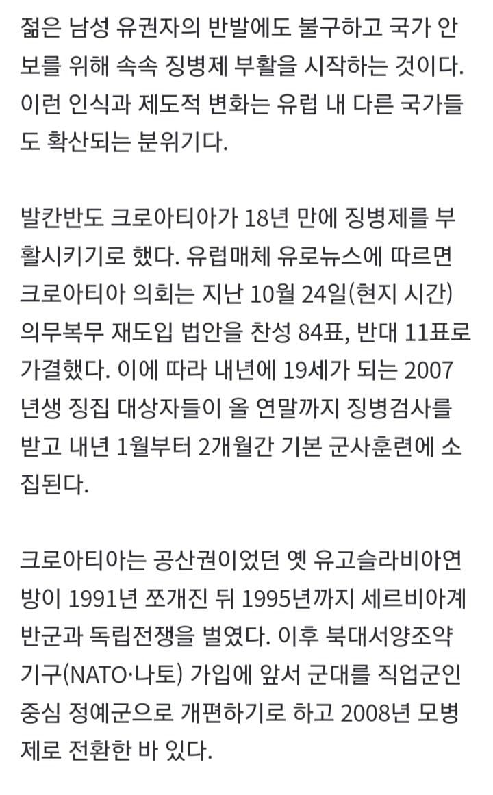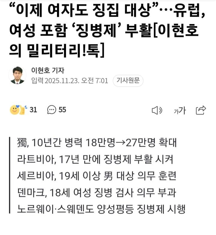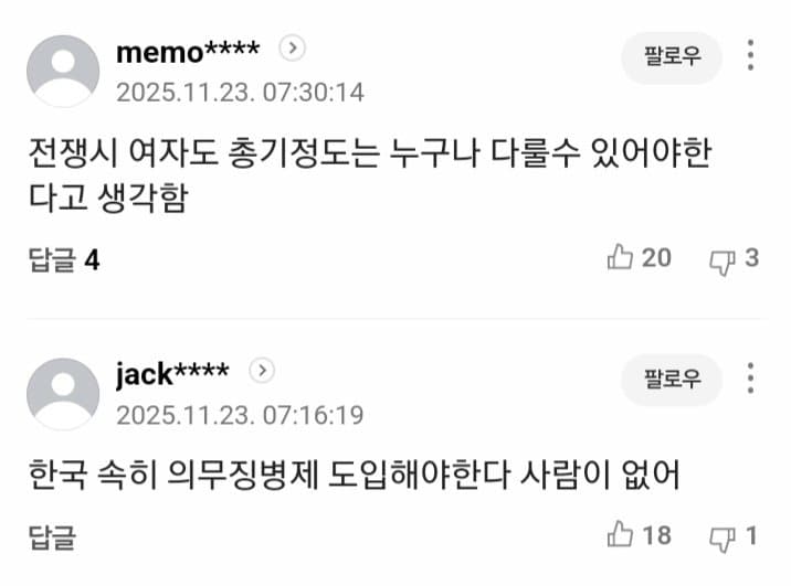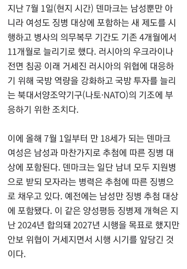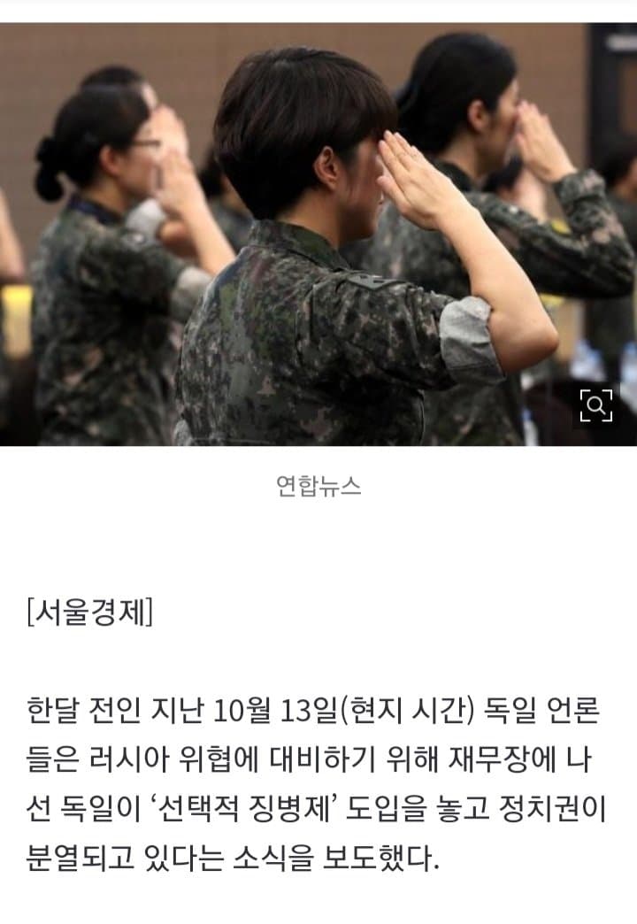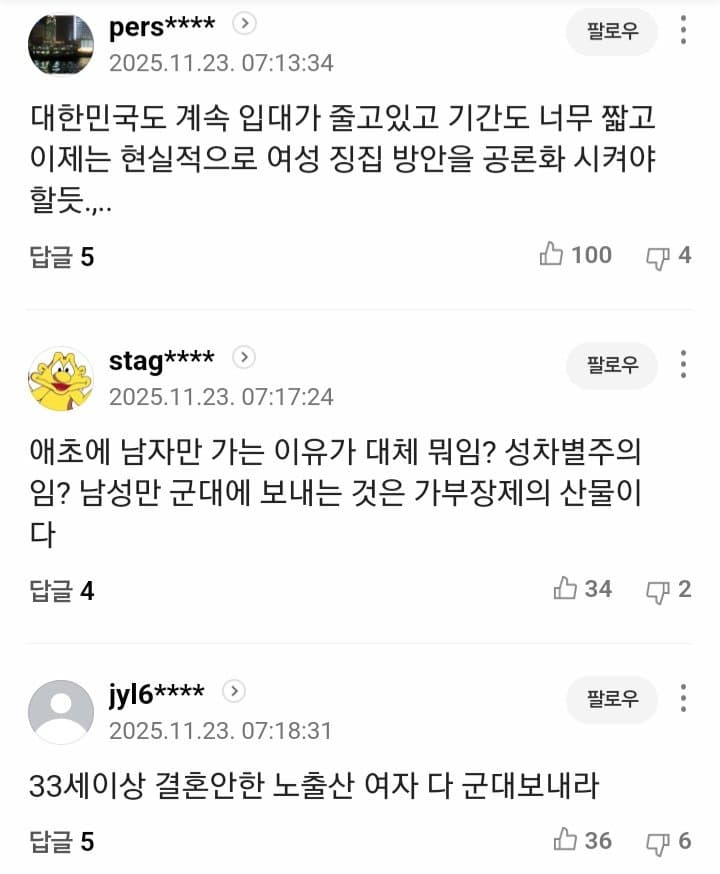 우리나라같이 전쟁 발발 가능성 0%인 국가에서솔직히 여자는 징집 안하는게 맞지 ㅋㅋㅋ이대남들조차 여자는 군대 안가는게 맞다 생각하는 사람들 많을걸 ㅋㅋ