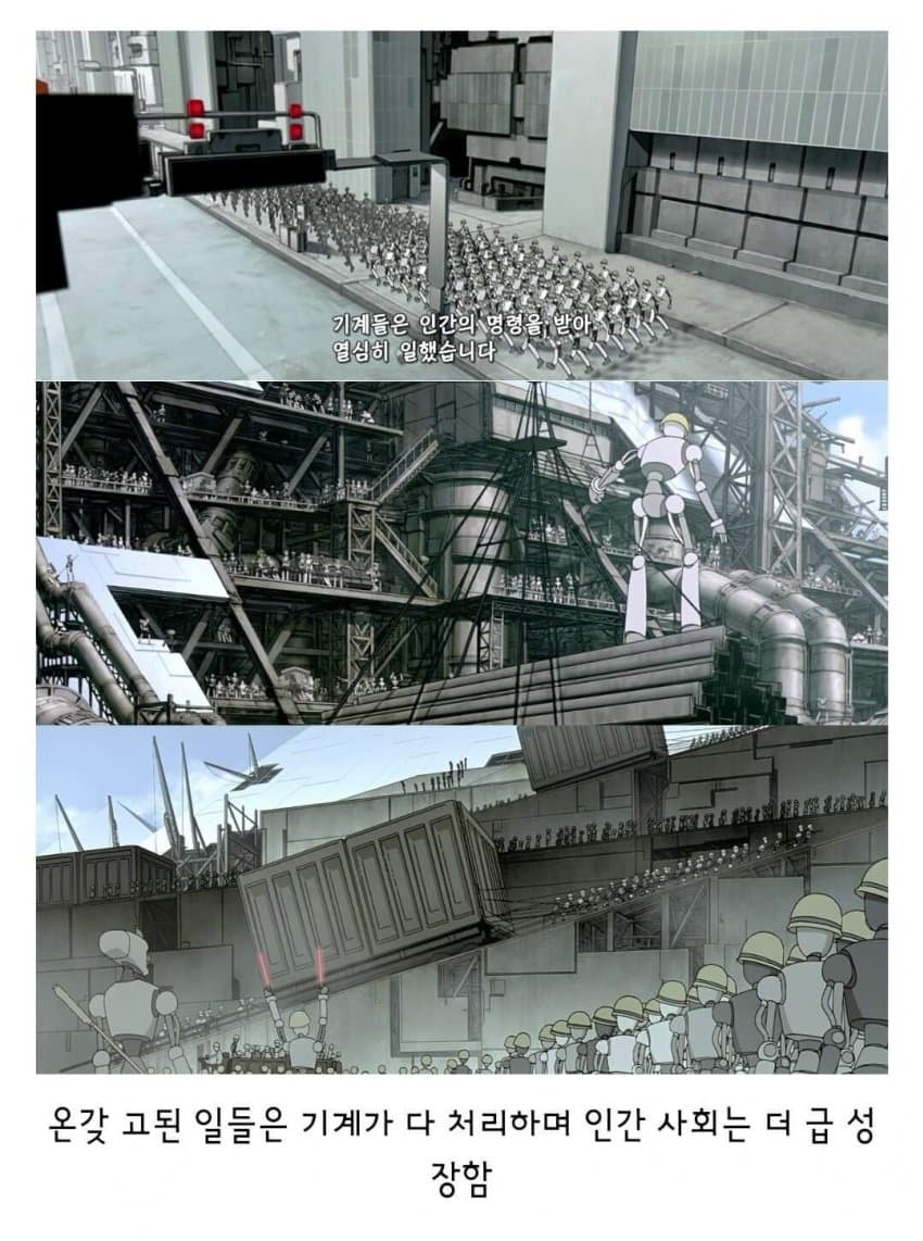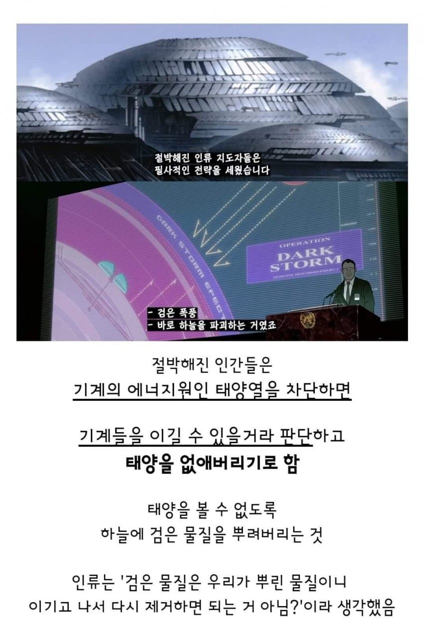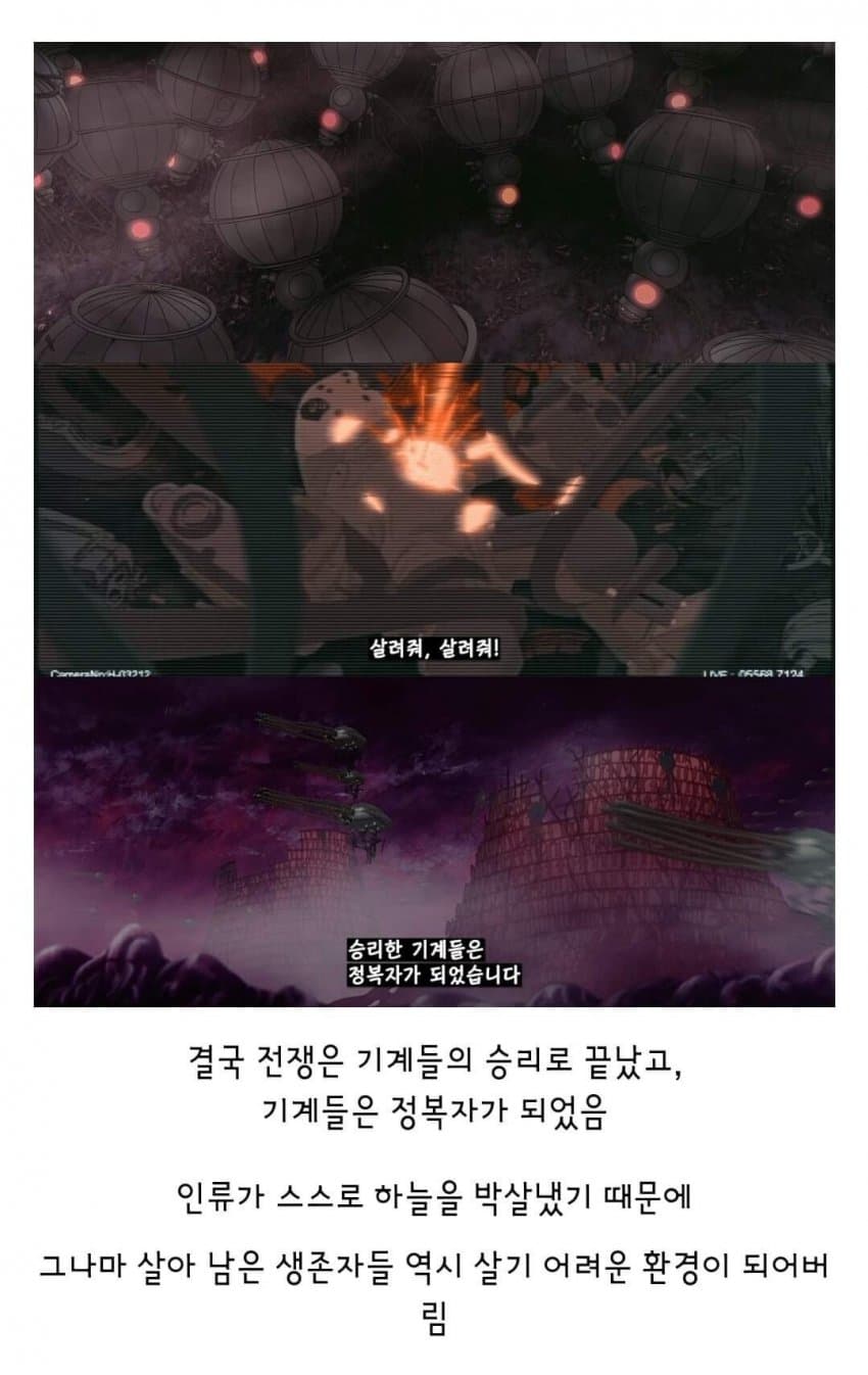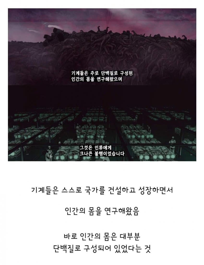 어차피 기계들은 핵융합으로 전력얻고 있어서인간은 그냥 자신들의 창조주라 예우로 살려두는거.