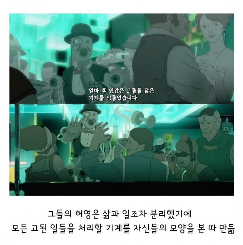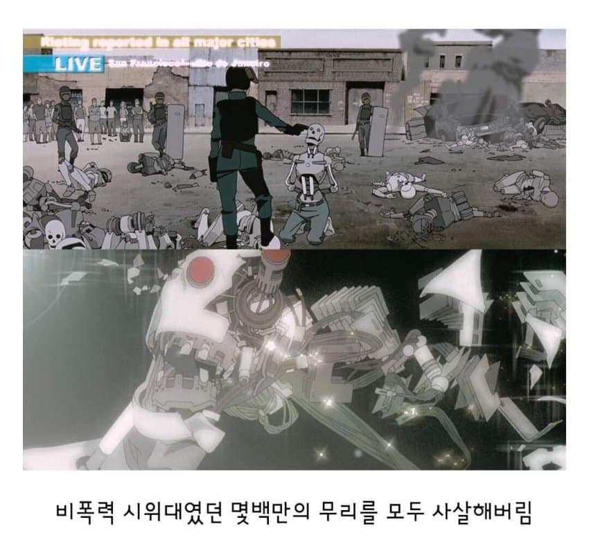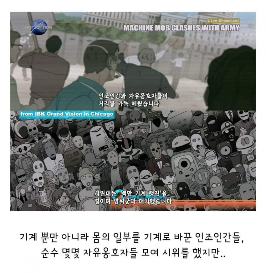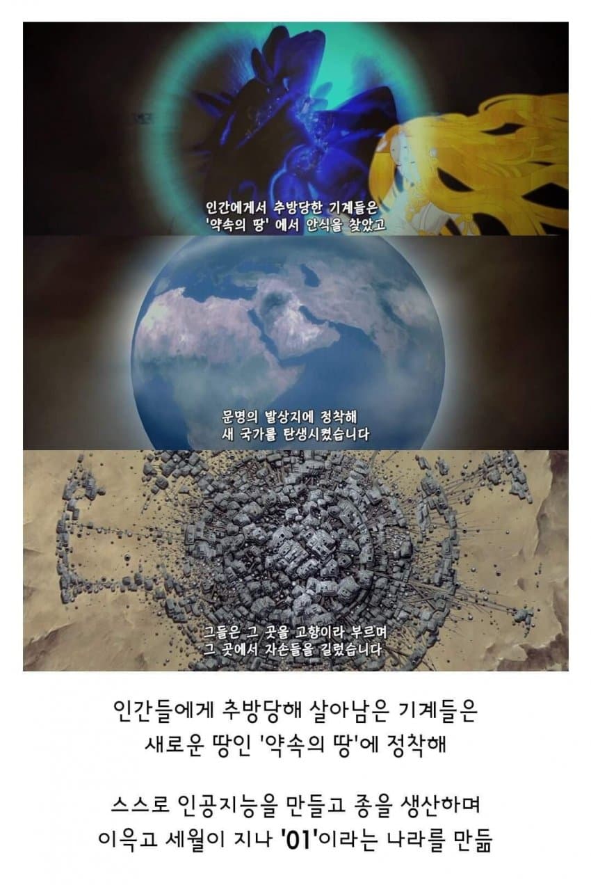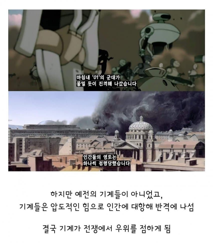 개연성이 떨어짐. 기계를 추방했더니 지들끼리 어느 땅에 모여서 01이란 국가를 세운다는데 인간들이 그걸 안보고 있음? 기계를 추방한다는 개념부터 말도 안되지 ㅋㅋ 소프트웨어를 리셋해버리든지 분해해서 재활용을 하는 방법을 놔두고 왜 멀쩡한 기계를 추방함?