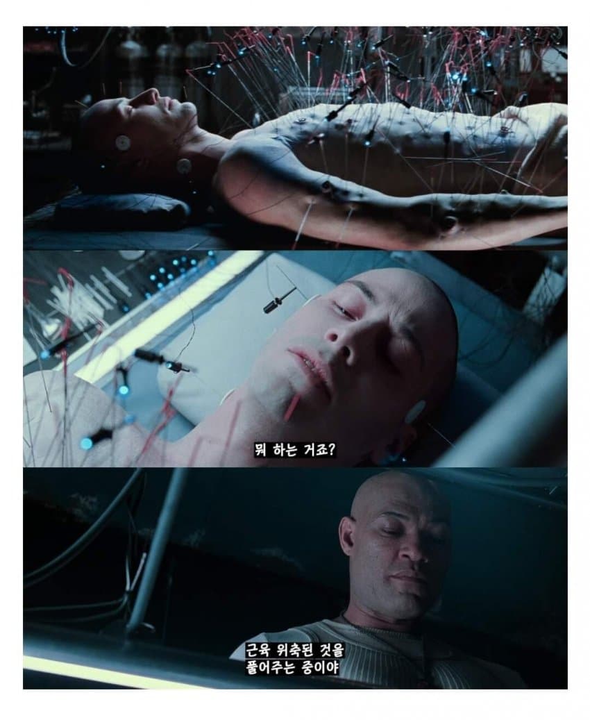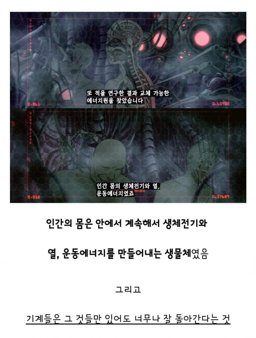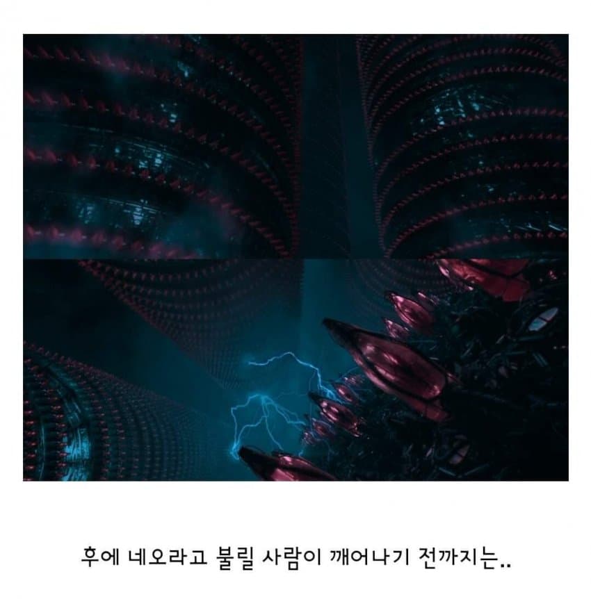 기계들이 인간을 가지고 전력생산하는 게 무슨 효율성이 있겠느냐라는 사람들이 있는데...저걸 메타포로 생각해보면 지금 인류가 현실생활 끊고 하루종일 틱톡 쇼츠영상이나 SNS질 하면서 골방생활 하는 거랑 판박이임.현생 끊은 방구석 폐인들 한 명, 한 명의 쇼츠영상질이나 SNS질은 별 거 아닌 것 처럼 보여도그게 대량으로 모이면 여론을 쥐고 흔들 수 있는 정치 권력이 되니까.오히려 전기 생산보다도 더 막강한 현실 파워 장악이지. ㅋㅋ