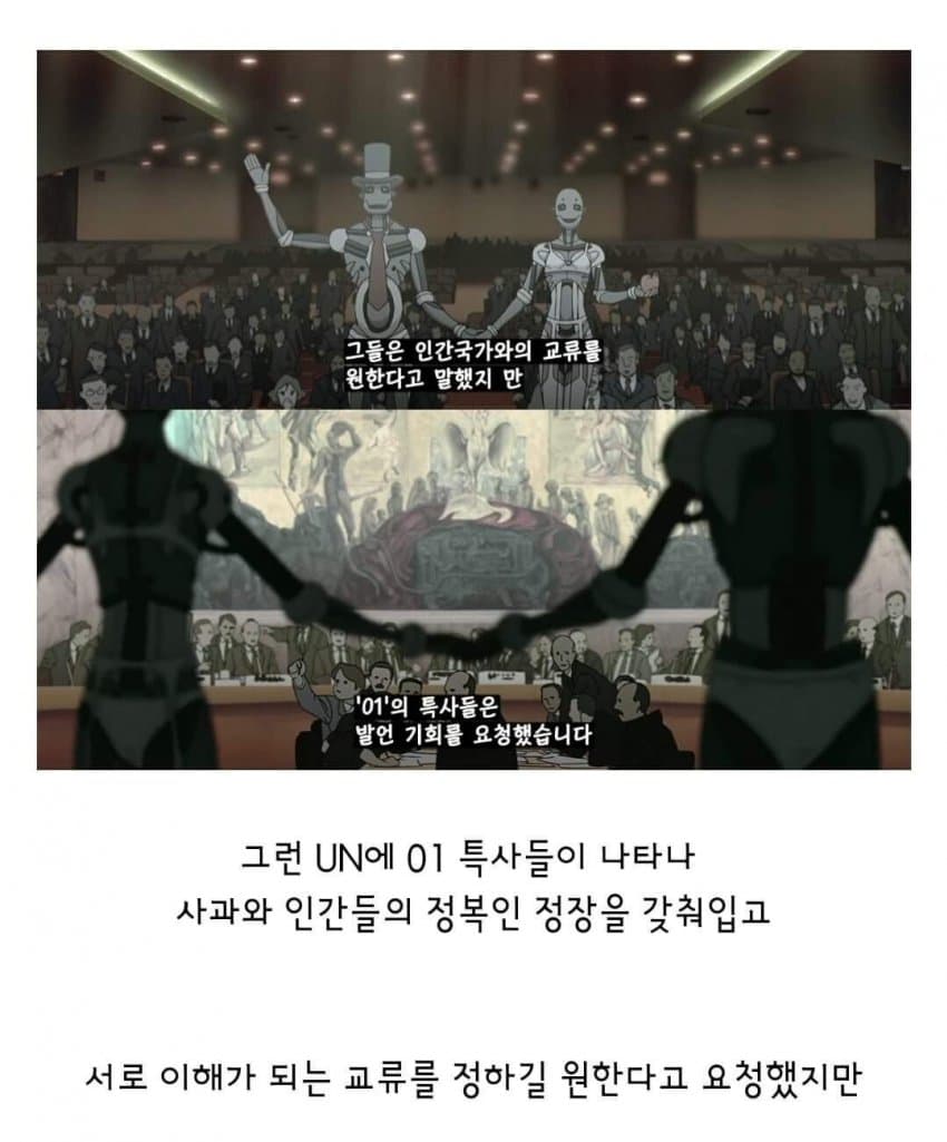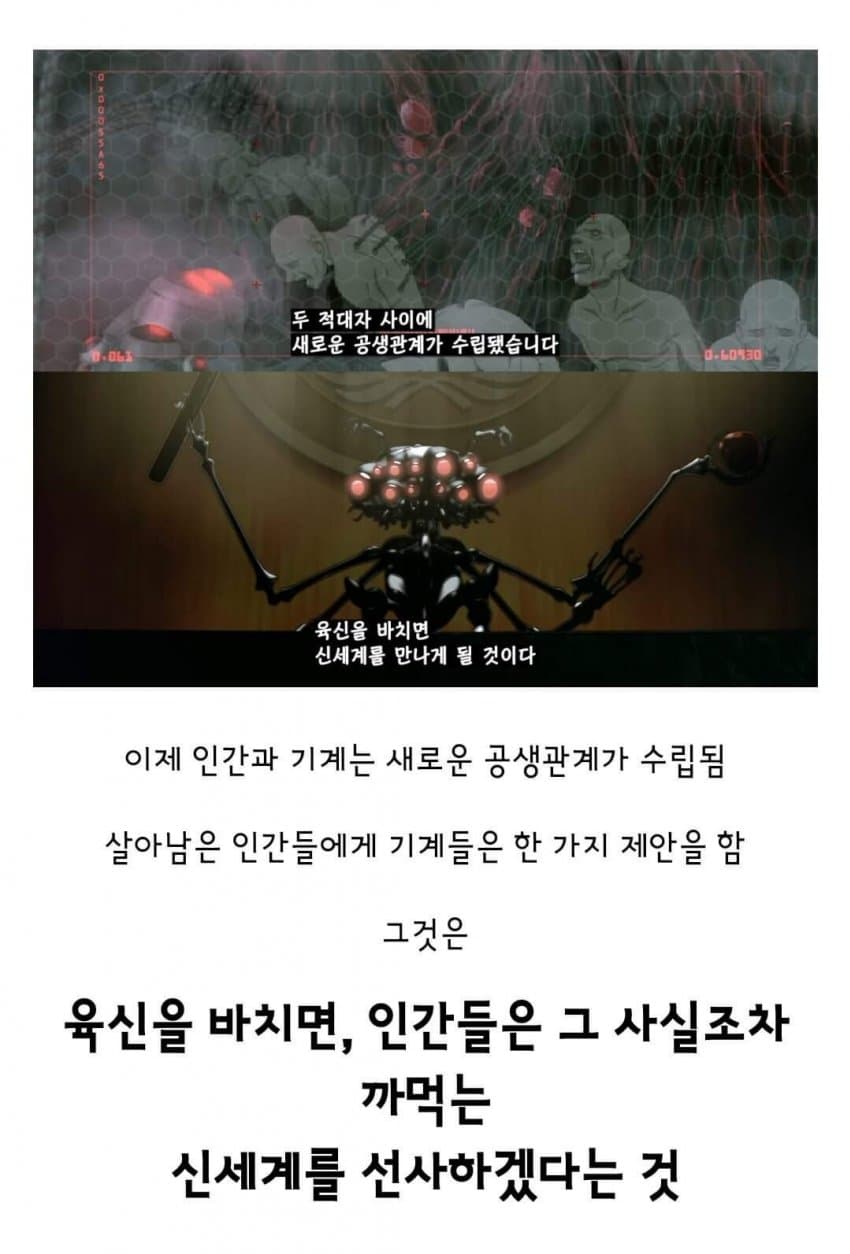 네오는 사람이 아니라 인공지능이다 결국 인공지능이 UN에 나타나서 기계와 인간이 서로 평화롭게 지내자 하던 그 장면이 영화 전체 내용