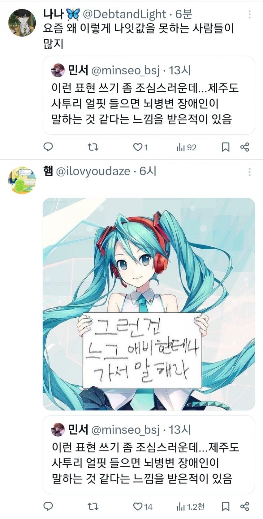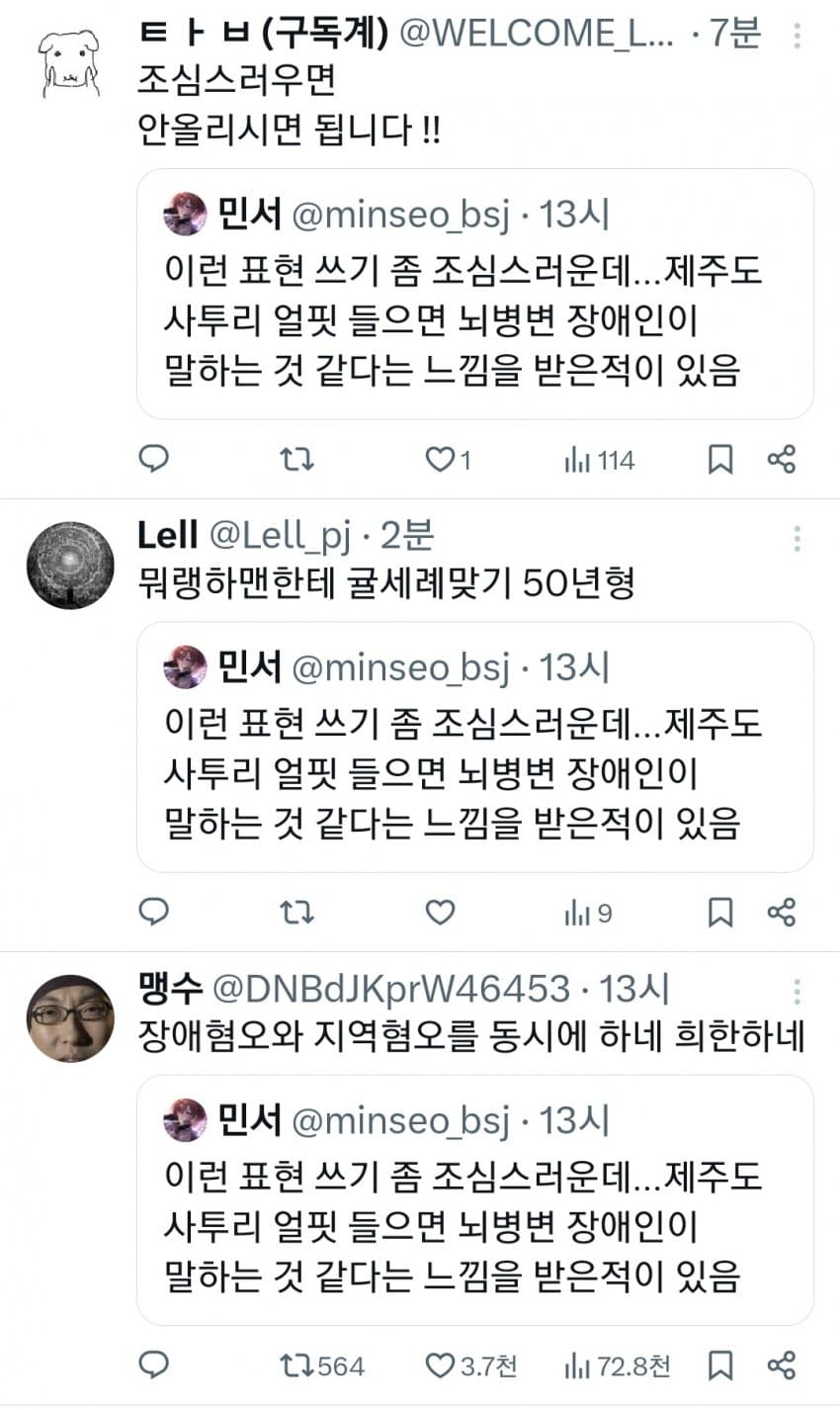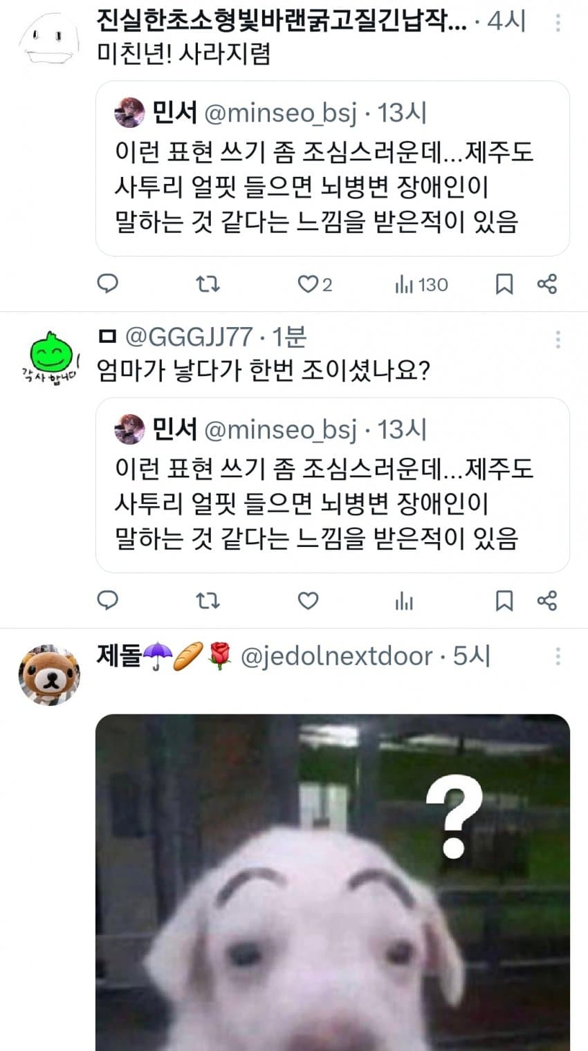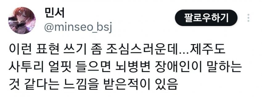 근데 한 80 먹은 노인들이 쓰는 사투리로 들으면 정체불명 외국어같긴함 ㅋㅋ 제주도 출신 선생님이 본가에 전화하는거 들어봤는데 외국어 하는줄 알았음 제주도 사람인줄 몰랐으면 국제결혼 한줄 알았을듯