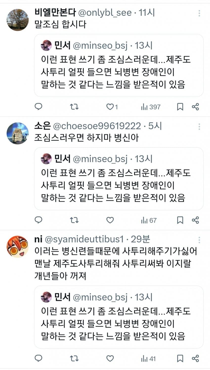 다른지역 사투리들이랑 다르게 제주도는 아예 다른언어체계같아서문장을 말하다말고 으엑앤 으어억언 ~ 하거든