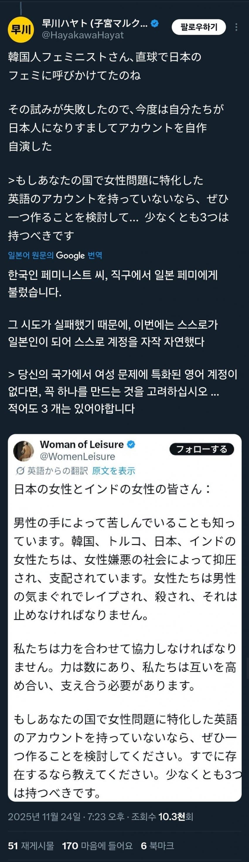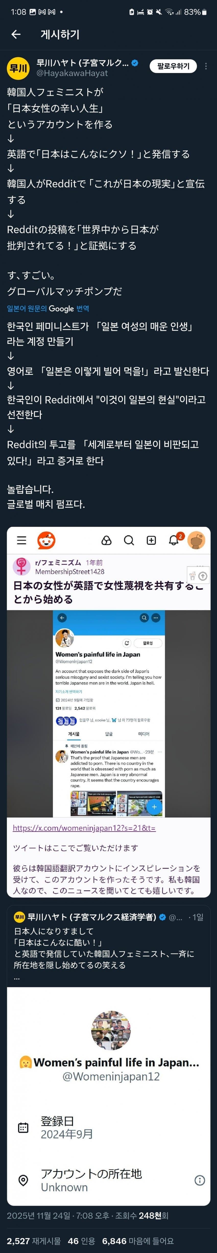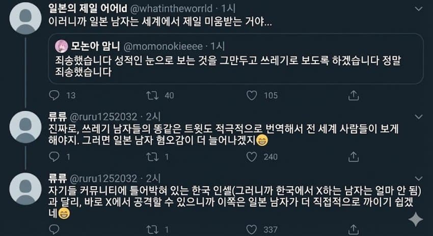 일본도 슬슬 페미들의 전략을 깨닫고 있네.저런식으로 지들끼리 언어, 플랫폼만 바꿔가면서 남혐주작글 돌려쓰다 심심하면 한번씩 복붙하고 기사로 내서 페미들 장작 던져주고 페미 예산좀 타오고 또 처음으로 돌아가서 남혐 주작글 돌려쓰고 계속 반복하는거지