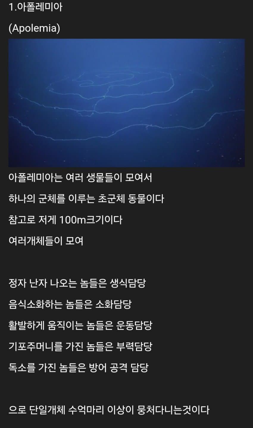 여러개체인데 단일개체인게 먼소리임 한죵류생물이 여러개가모여잇다는거야아님 유전적으로는 같은데 그게 여러개체고 그게 각각 역할이다르다는거야 뭥8