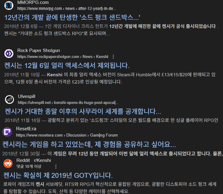 다행히, 켄시는 그 이전에 그 중에서도 프로젝트 좀보이드, 크라이 오브 피어 등의 지금까지도 플레이되는 걸출한 게임들과 함께