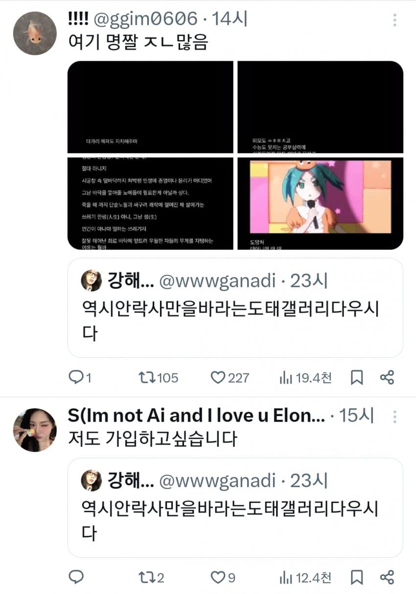 나는 차라리 2D에 도피하면서 자학하는 놈들이 보기에 낫지 자기관리 안되고 트위터에서 깽판치면서도 부끄러운줄 모르는 년들은 보기 불쾌해서 안되겠다